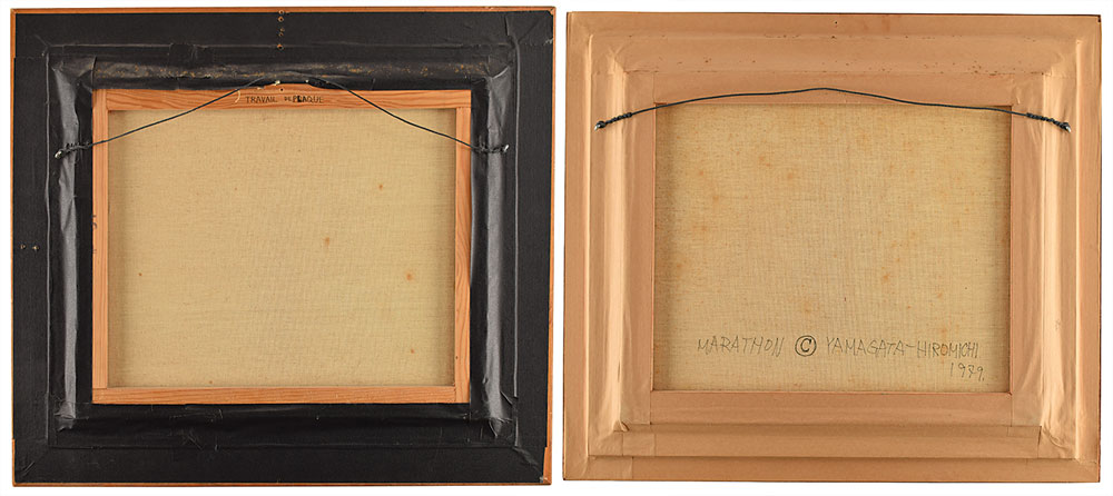 Sib Hashian's personally-owned pair of two relatively early, vivid original paintings by Hiro Yamagata: one entitled "Travail de Plaque" depicting a balloon festival, accomplished in acrylic on stretched 17.5 x 14.5 canvas, signed and dated in the lower right corner, "Yamagata 77"; and the other entitled "Marathon" showing a race through the streets of Paris, accomplished in acrylic on 17.75 x 14.75 stretched canvas, signed and dated in the lower right, "Yamagata 79." Both pieces are matted and framed to 23.5 x 20.5, and titled on the reverse. In overall fine condition. These wonderful paintings by Yamagata showcase his distinctive style in portraying 'flat' cityscapes, as well as his brilliant use of vibrant color. A superb pair of original artworks owned by a legendary musician.