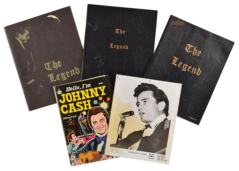 Group of Johnny Cash-related books and ephemera, including: a "Hello, I'm Johnny Cash" comic book, published in 1976 by Spire Christian Comics; three different issues of "The Legend," published by the Johnny Cash Appreciation Society in the late 1960s; a glossy 8 x 10 Johnny Cash Society promo photo; and a Johnny Cash Society form letter announcing the tragic death of Luther Perkins. In overall very good condition, with tack holes and staining to the photos, and some edge tears and creasing to the books and letter.