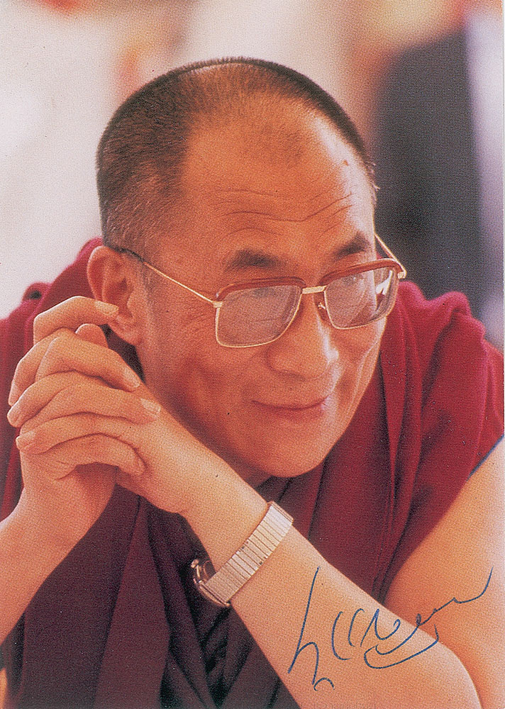 Color glossy 3.5 x 5 cardstock photo of the Dalai Lama with his hands clasped, signed in Tibetan in blue ballpoint. In fine condition.