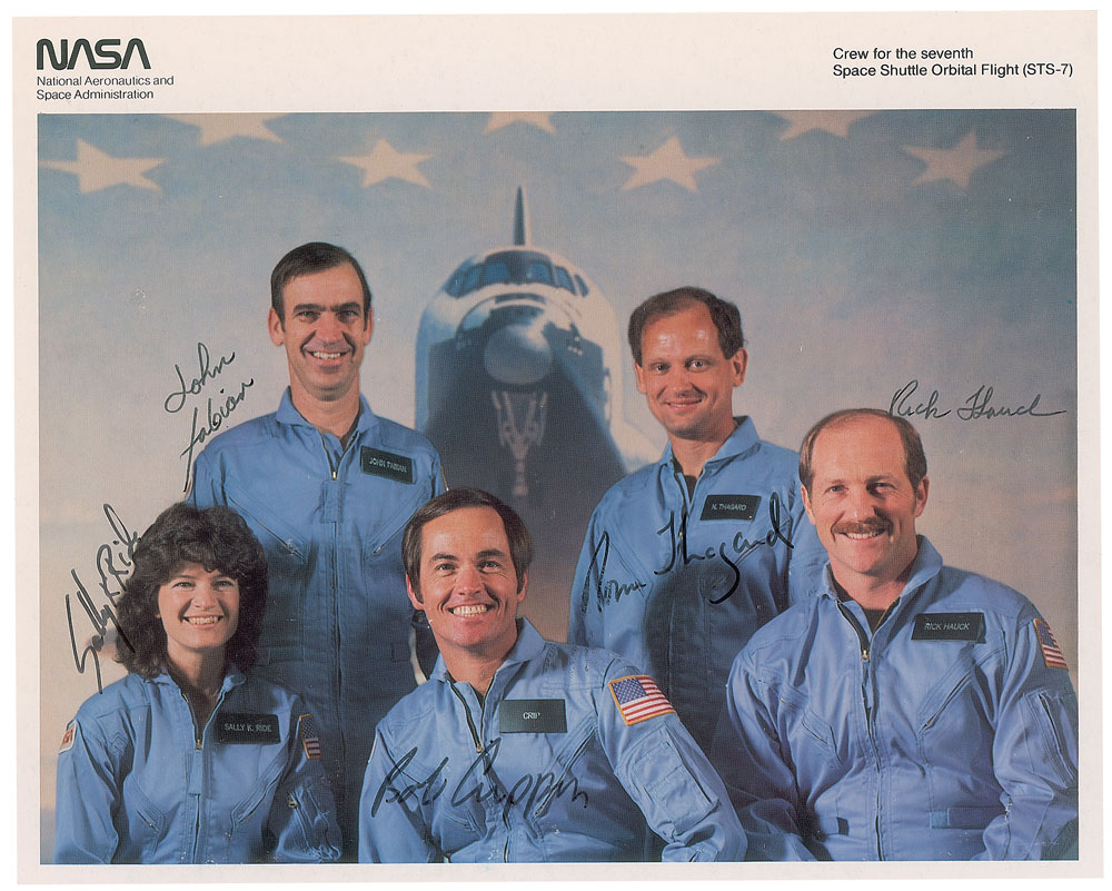 Official color 10 x 8 NASA lithograph of the STS-7 crew in their blue flight suits, signed in felt tip by Sally Ride, Bob Crippen, Norm Thagard, John Fabian, and Rick Hauck. In fine condition, with dings to corner tips.