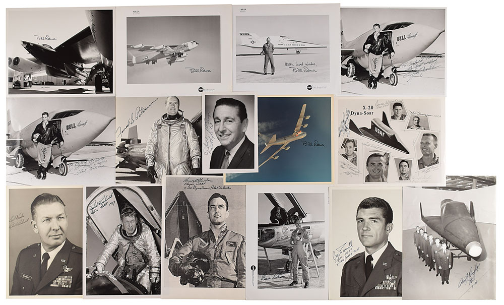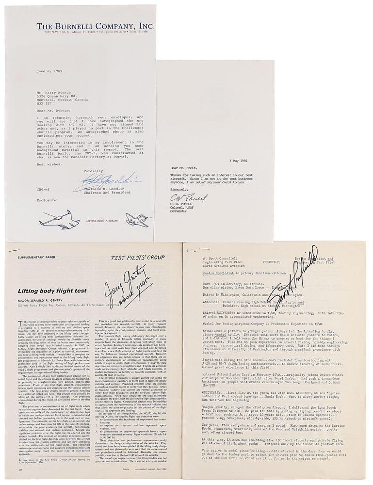 Collection of 19 items signed by notable experimental test pilots, including: Forrest S. Petersen (SP), Slick Goodlin (two SPs and TLS), Robert Rushworth (two SPs), Henry C. Gordon (paperstock SP), Bruce Peterson (SP), Cecil W. Powell (SP and card), Pete Knight (two SPs), Jerauld R. Gentry (article), Bill Dana (four SPs), and Scott Crossfield (SP and bio sheet). In overall fine condition.