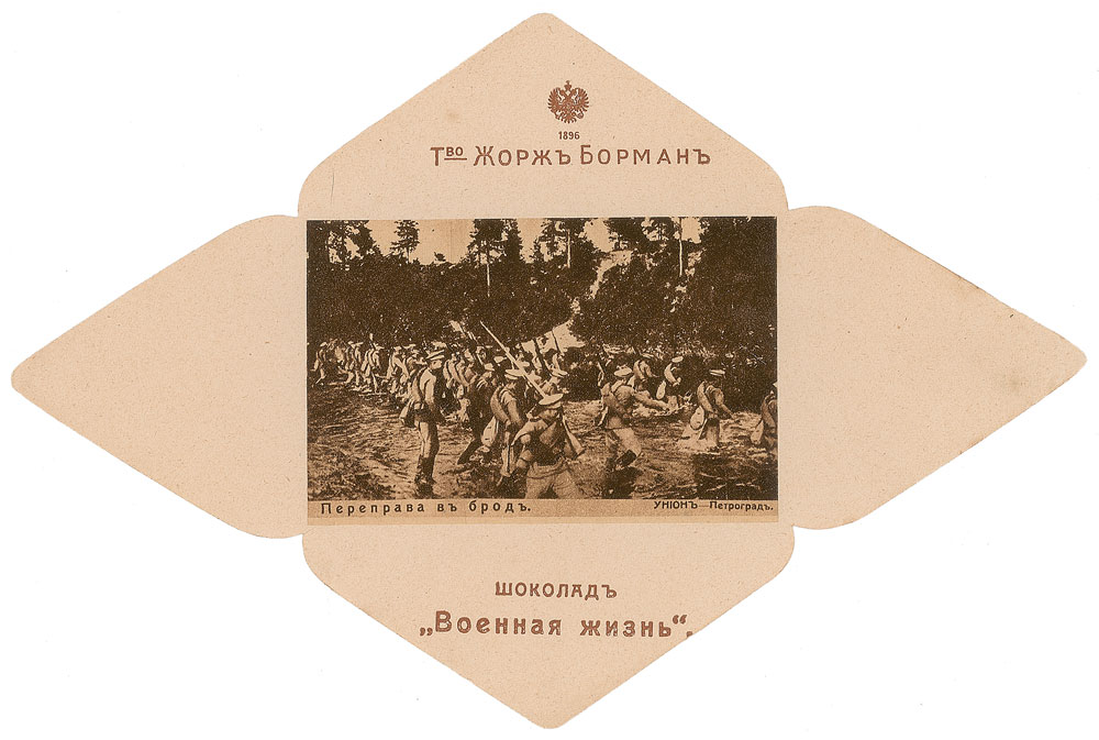 Two circa 1914 unused chocolate bar wrappers from the Patisserie George Borman in St. Petersburg, each measuring 9 x 6. Presumably issued in the early stages of World War I, they feature two different images of Russian troops preparing for battle. In fine condition.