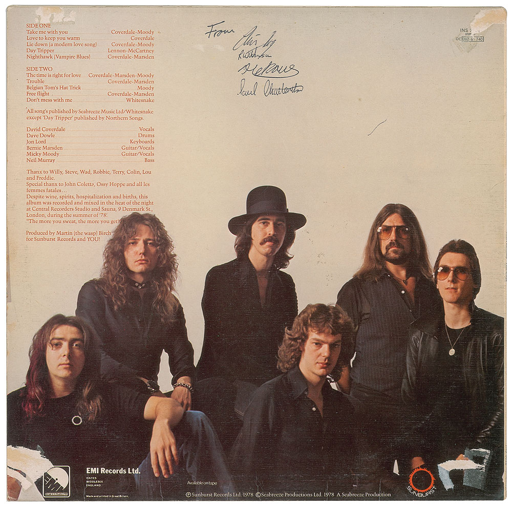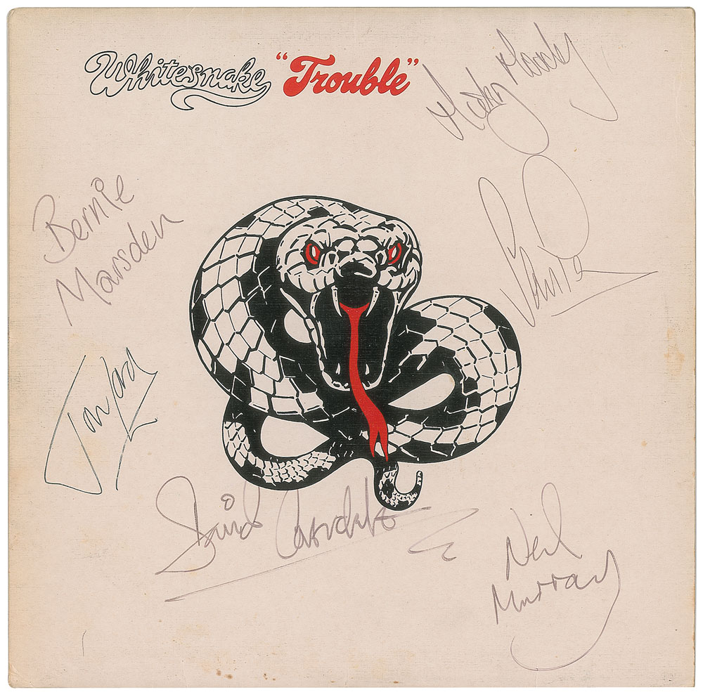 'Trouble' album by Whitesnake, signed on the front cover in black ink or felt tip by Bernie Marsden, Micky Moody, David Coverdale, Neil Murray, Jon Lord, and Ian Paice. In fine condition, with light scuffing and a few small stains, and annotations and paper loss to back cover. The record is not included.