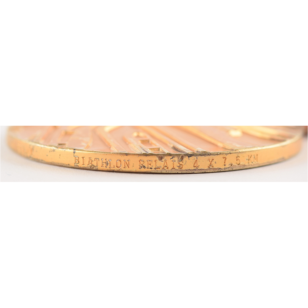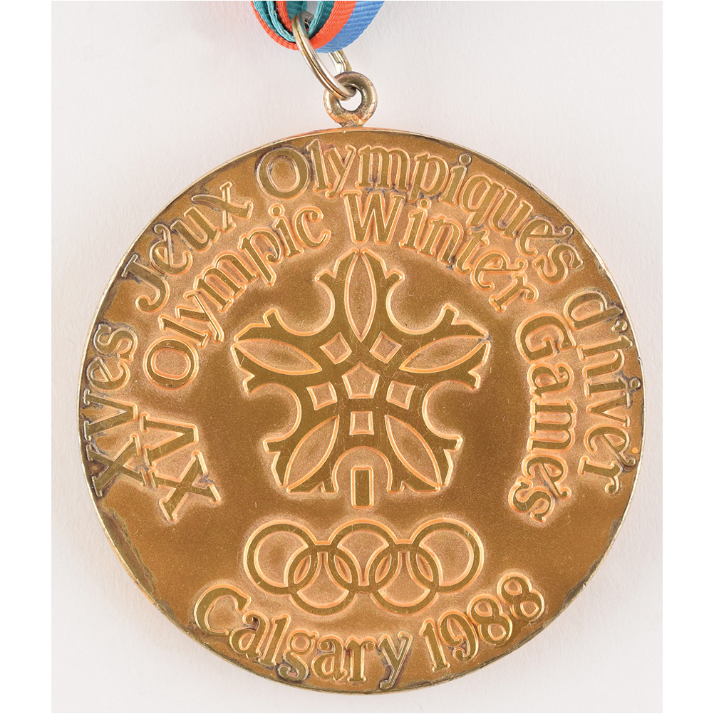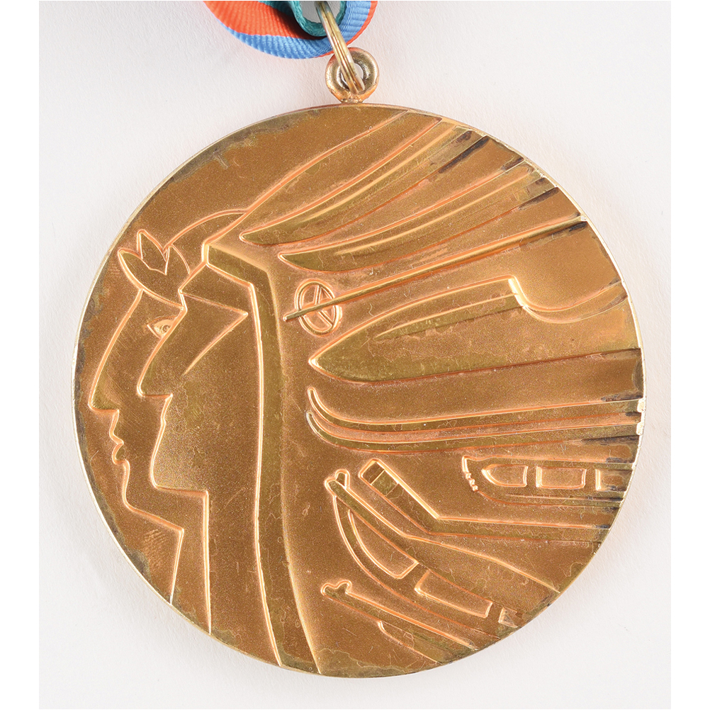 Exceptionally rare winner’s medal issued for the Calgary 1988 Winter Olympics. Gilt silver, 69 mm, 198 gm, by Peter Friedrich. The front depicts combined profiles of a laureated athlete and a First Nations indigenous person whose headdress is formed by winter sporting equipment; the reverse bears the stylized snowflake/maple leaf emblem of the Games and the Olympic rings at center, with surrounding raised bilingual text: "XVes Jeux Olympiques d'hiver, XV Olympic Games, Calgary 1988.” The edge of the medal engraved in English and French with the name of the event: “Biathlon 4 x 7.5 KM Relay.” The medal is suspended from its cyan, red, and blue ribbon, and is accompanied by its original blue velvet case.