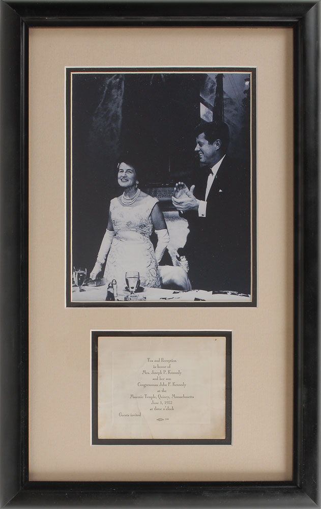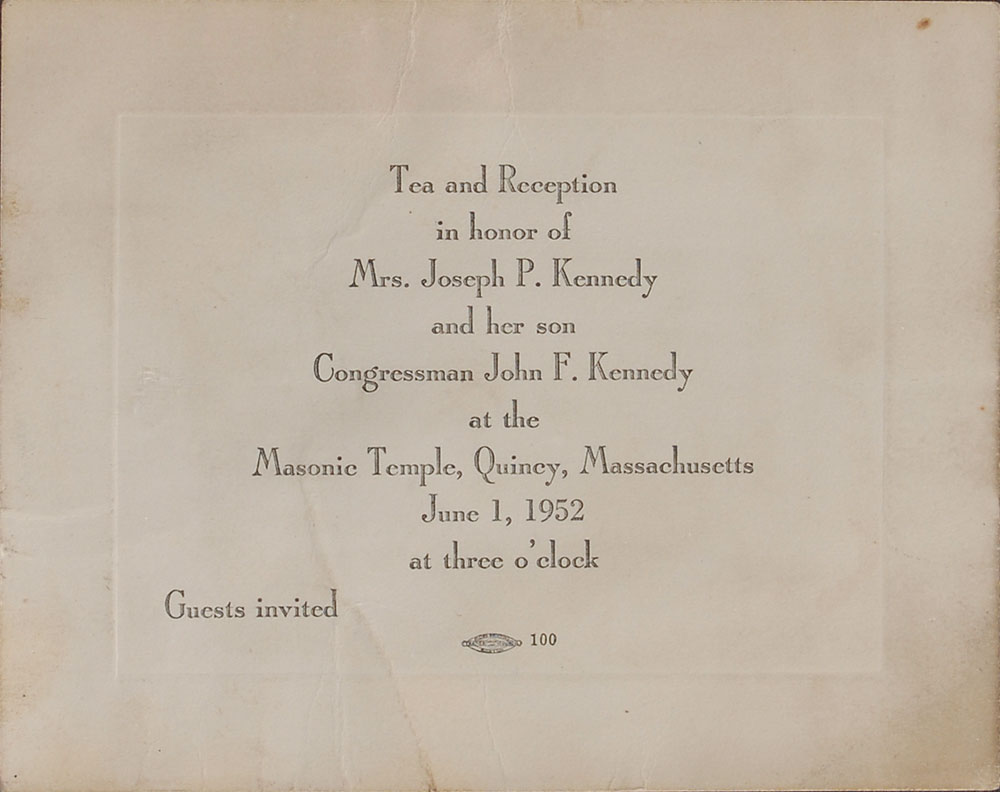 The famous Kennedy "Teas" of 1952—rare printed invitation for one of the events honoring JFK's mother, Rose, in Quincy, Mass. on June 1, 1952, featuring the text: "Tea and Reception in honor of Mrs. Joseph P. Kennedy and her son Congressman John F. Kennedy." A key to Kennedy's victory over Henry Cabot Lodge for the Mass. Senate seat in 1952 were these 'teas' where up to 5,000 women came dressed up to meet JFK, his mother, and his three sisters Jean, Pat, and Eunice who all stood on line for hours to shake the hands of every woman who attended these events. JFK was on crutches in many of these "teas."