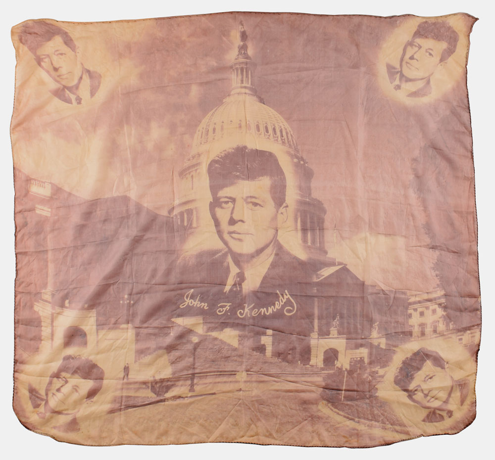 1952 Senatorial Campaign silk scarf—34″ x 32″ violet and cream-colored silk scarf featuring a 1952 portrait of JFK superimposed on the Capitol—excellent condition.