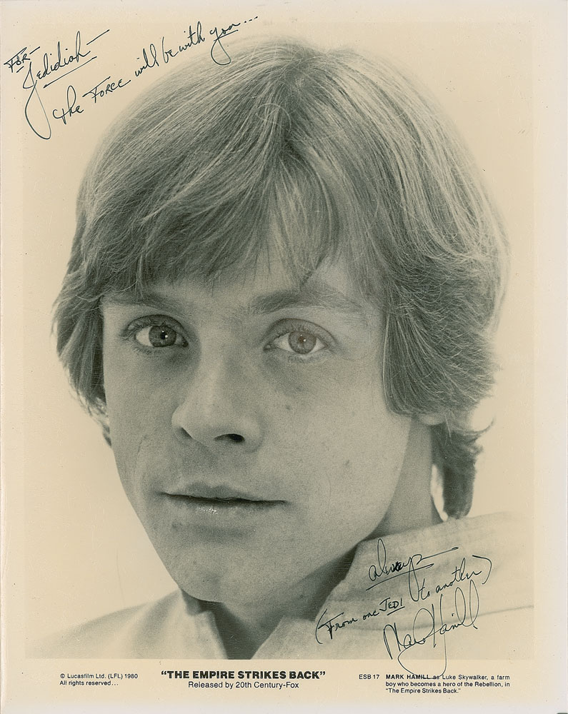 Glossy 8 x 10 Twentieth Century Fox publicity photo of Mark Hamill as Luke Skywalker from The Empire Strikes Back, signed and inscribed in black ink, "For Jedidiah—The Force will be with you?Always, (From one Jedi to another), Mark Hamill.” In very good condition, with a few creases, and moderately heavy overall crazing the emulsion.