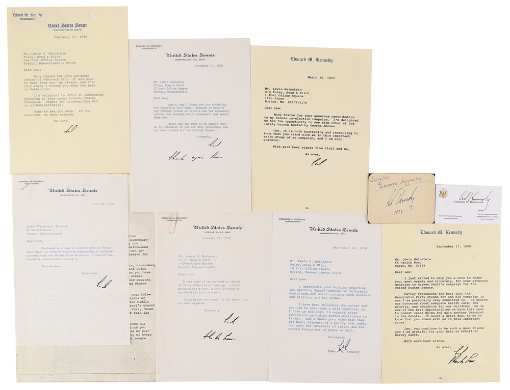 Group lot of seven TLSs from Massachusetts Senator Ted Kennedy, each signed “Ted,” each one page, dated between 1968 and 1993, United States Senate and personal letterhead. Each letter is addressed to Lewis H. Weinstein. Highlights include: December 18, 1968: “Again, may I thank you for attending the reception last week. Because so many of our friends joined us in this sad but necessary effort, the evening was a successful and memorable one. Ethel and the rest of my family join me in extending to you our deepest gratitude”; July 30, 1970: “Enclosed is a copy of a letter sent to President Nixon by several Senators expressing a continued concern with the Middle East situation,” with letter copy stapled to upper left corner; and September 17, 1990: “Harvey [Gantt] represents the best that the Democratic Party stands for and his campaign is one I am personally very committed to.” Kennedy adds a few brief handwritten postscripts to three of the letters. Also included is a felt tip signature, “Ted Kennedy, 1973,” on an off-white 3.5 x 2.5 card, and a personal United States Senate card belong to Kennedy, which he has signed in black ink. In overall fine condition.