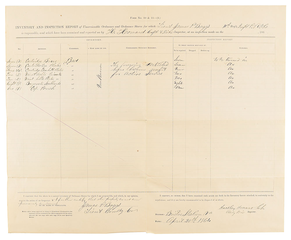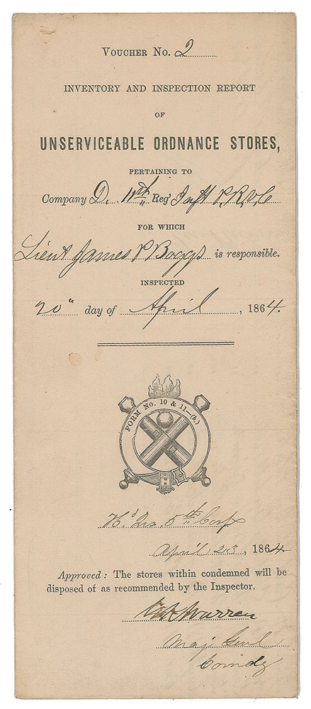 American military officer (1830-1882) who, despite earning the sobriquet 'Hero of Little Round Top' for his actions at Gettysburg, was humiliated when General Philip Sheridan removed him from command after Warren's supposedly ineffective performance at Five Forks. Civil War-dated partly-printed DS, signed “G. K. Warren,” one page, 17 x 14, April 23, 1864. An "Inventory and Inspection Report of Unserviceable Ordnance Stores," approved on the docketing panel by Warren. The document lists the "Unserviceable Ordnance and Ordnance Stores for which Lieut. James P. Boggs…is responsible and which have been examined and reported on by H. Howard, Capt. & Div. Inspector," accounting for poor condition cartridge boxes, cartridge box plates, cartridge box belt plates, waist belts, waist belt plates, bayonet scabbards, and cap pouch. In fine condition.