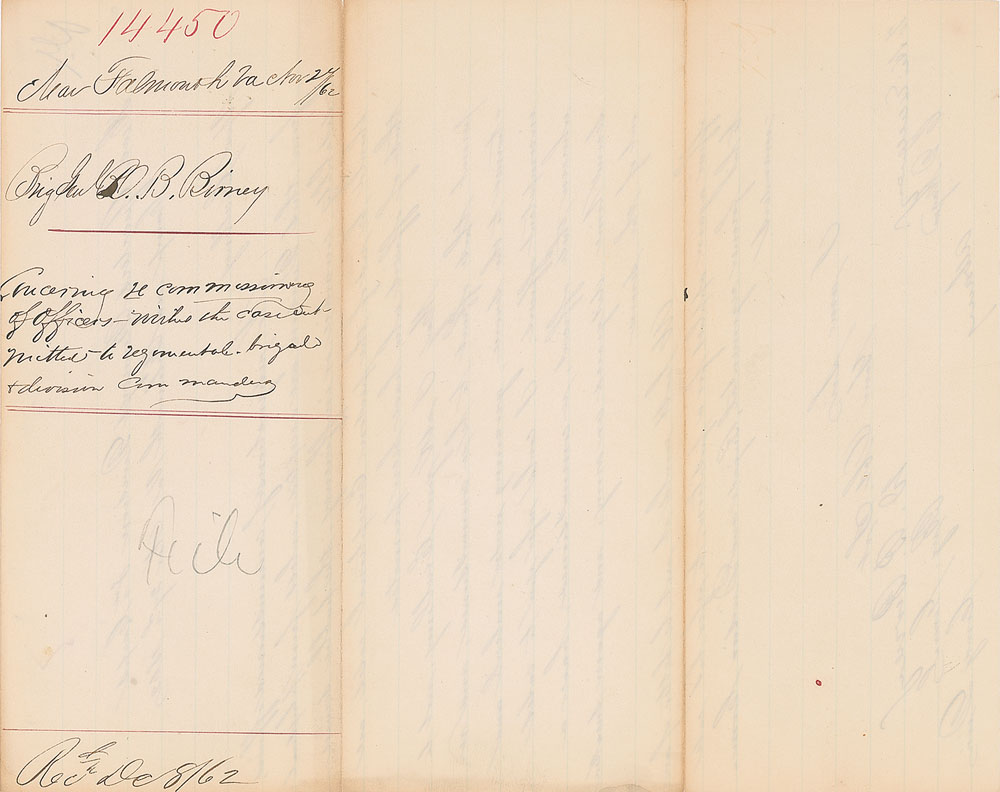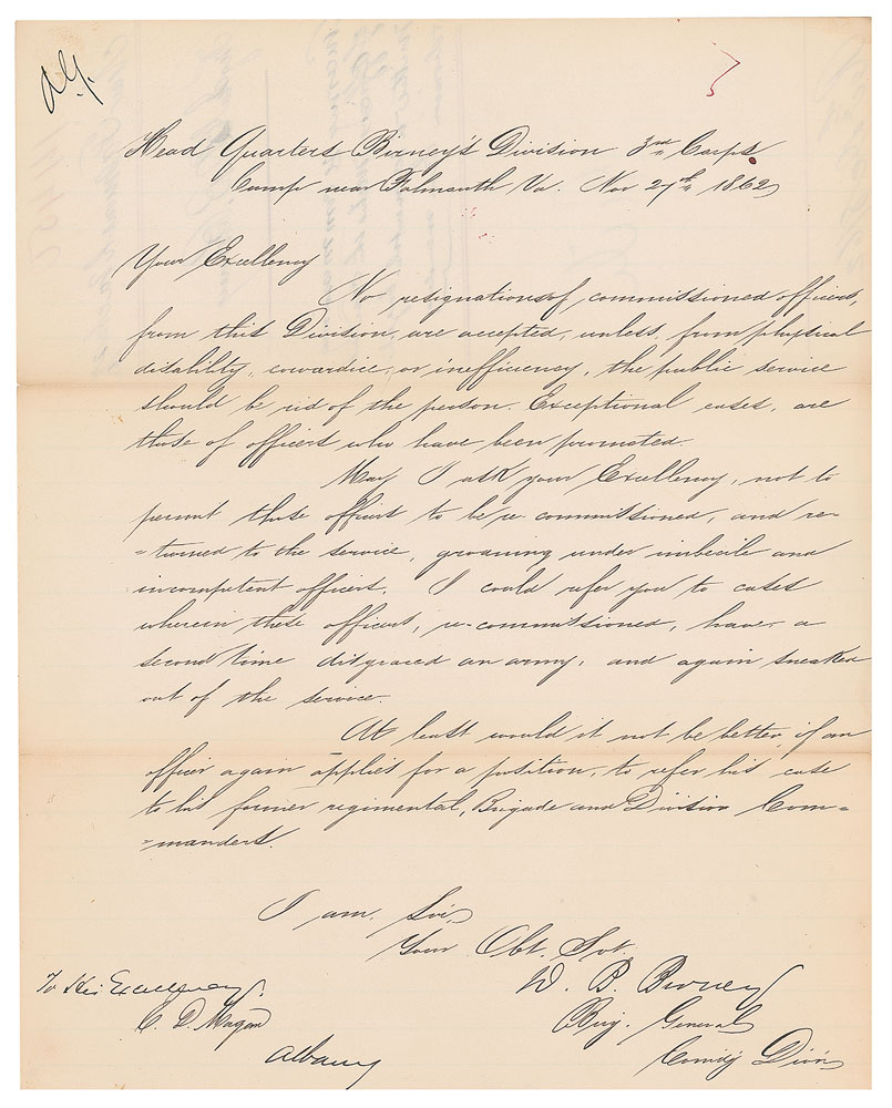 Union general (1825-1864) who fought as a division commander of General Sickles' 3rd Corps at Gettysburg, and took command of the corps after Sickles was seriously wounded. He also served with distinction with the Army of the Potomac in the 1864 Overland campaign; he was stricken with malaria and died on October 18, 1864. Civil War-dated ALS signed “D. B. Birney, Brig. General, Comd'g Div'n,” one page, 7.75 x 9.75, November 27, 1862. Letter to Governor E. D. Morgan of New York in the days preceding the Battle of Fredericksburg, regarding the resignation and reassignment of officers. In part: "No resignations of commissioned officers from this Division are accepted, unless, from physical disability, cowardice, or inefficiency, the public service should be rid of the person?May I ask your Excellency not to permit these officers to be re-commissioned, and returned to the service, groaning under imbecile and incompetent officers." In fine condition, with faint toning along folds.