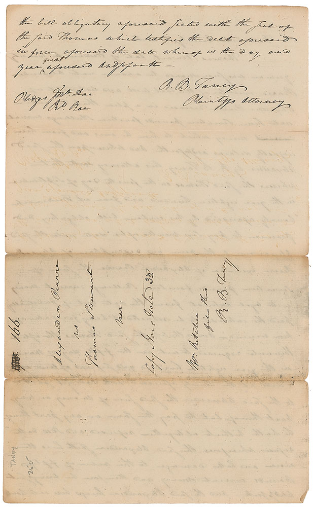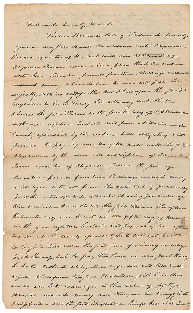 ADS, signed three times, “R. B. Taney,” one page, 7.75 x 12.75, no date but circa 1806. Document written as the plaintiff's attorney in a case regarding the collection of a promissory note. In part: "Whereupon the said Alexander by R. B. Taney his attorney saith that whereas the said Thomas on the fourth day of September in the year eighteen hundred and five at Frederick County aforesaid by his certain bill obligatory did promise to pay six months after date?the sum of seventeen pounds fourteen shillings current money." The document is signed by Taney within the text, at the conclusion, and on the docketing panel. In fine condition, with a few small edge splits.