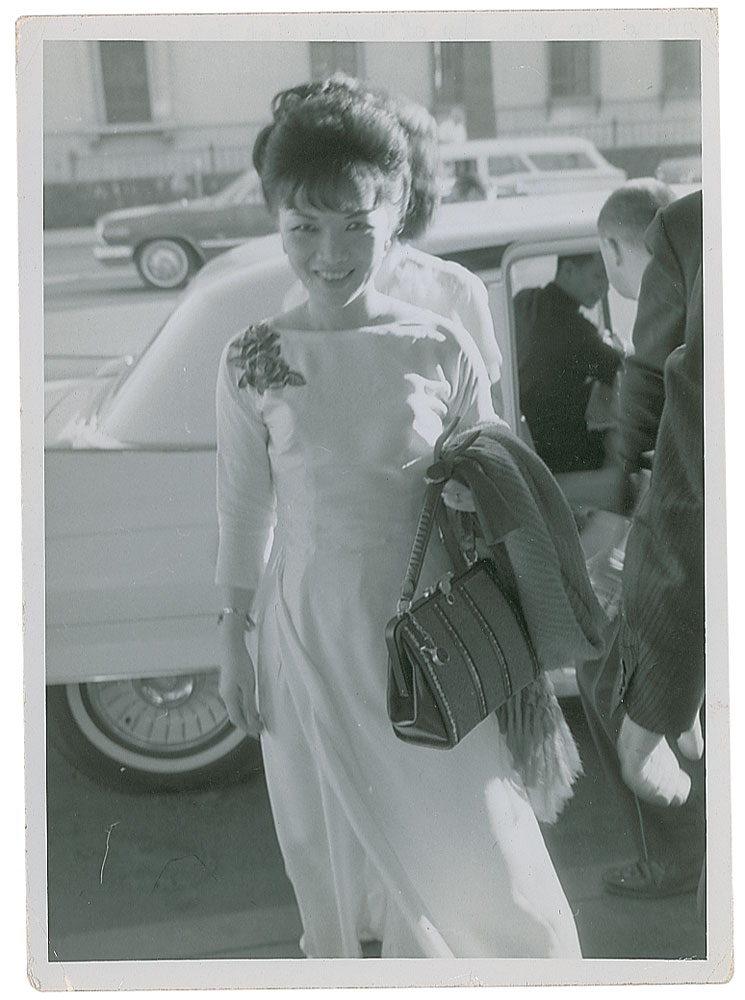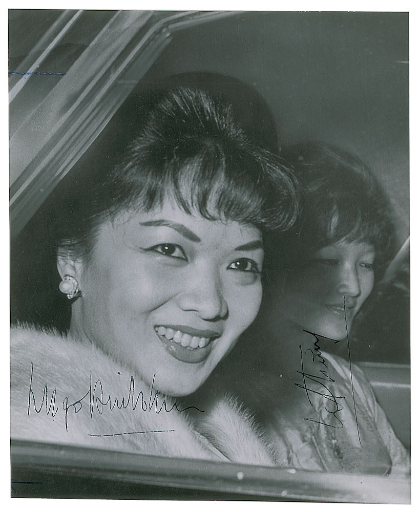 The de facto First Lady of South Vietnam from 1955 to 1963 as the wife of Ngo Dinh Nhu, brother and chief advisor to the bachelor president Ngo Dinh Diem. Vintage glossy 5.5 x 6.75 photo of Madame Nhu and her daughter Ngo Dinh Trac, signed in fountain pen by both. Reverse bears typed collector's notations indicating that it was signed at the Westward Ho in Phoenix, Arizona, on October 25, 1963. In very good to fine condition, with trimmed edges, two ballpoint ink lines on the left edge, and surface impressions at the top from typed notations on the back. Accompanied by a candid photo of Madame Nhu taken in Phoenix.