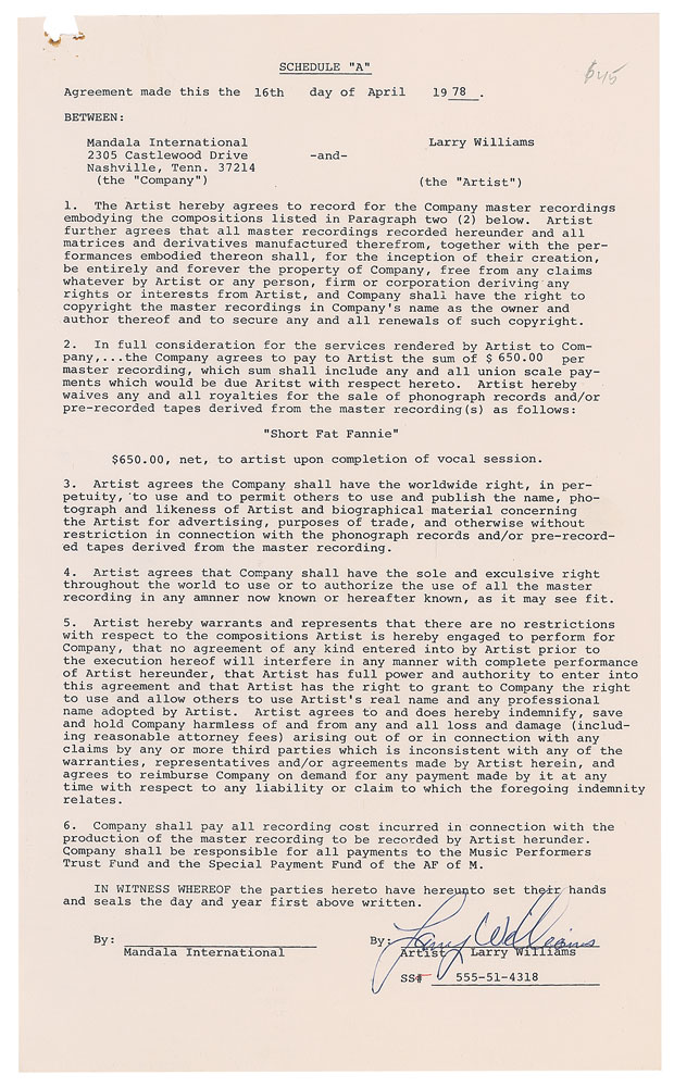 R&B and rock singer/songwriter (1935-1980) whose hits included 'Bony Moronie,' 'Slow Down,' 'Dizzy, Miss Lizzy,' 'Bad Boy,' and 'She Said Yeah,' many of which were covered by the Beatles and other British bands. DS, one page, 8.5 x 14, April 16, 1978. Agreement between Williams and Mandala International, in which he waives "any and all royalties for the sale of phonograph records and/or pre-recorded tapes derived from the master recording(s) as follows: 'Short Fat Fannie,' $650.00 net, to artist upon completion of vocal session." In fine condition, with torn staple holes to the upper left corner. First released in 1957, 'Short Fat Fannie' was Williams's second single; peaking at number five on the US pop chart, and at number one on the R&B chart, it sold over one million records.