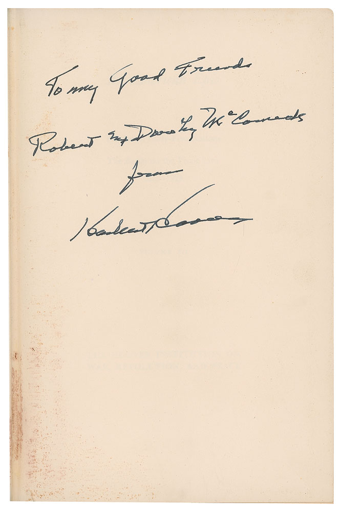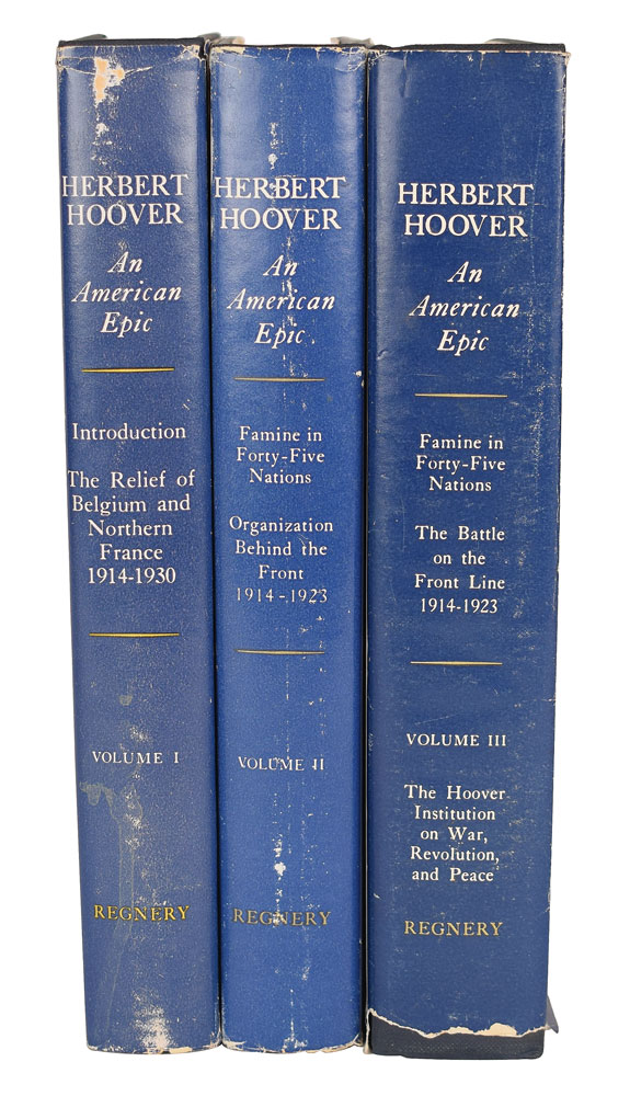 Three-volume book set: An American Epic. First editions. Chicago: Henry Regnery Company, 1959-1961. Hardcovers with dust jackets, 6.5 x 9.5. Signed and inscribed on the first free end page of volume three in black ink, "To my good friends Robert and Dorothy McCormack, from Herbert Hoover." In very good to fine condition, with wear to the dust jackets, and light staining to the lower left edge of the signed page.