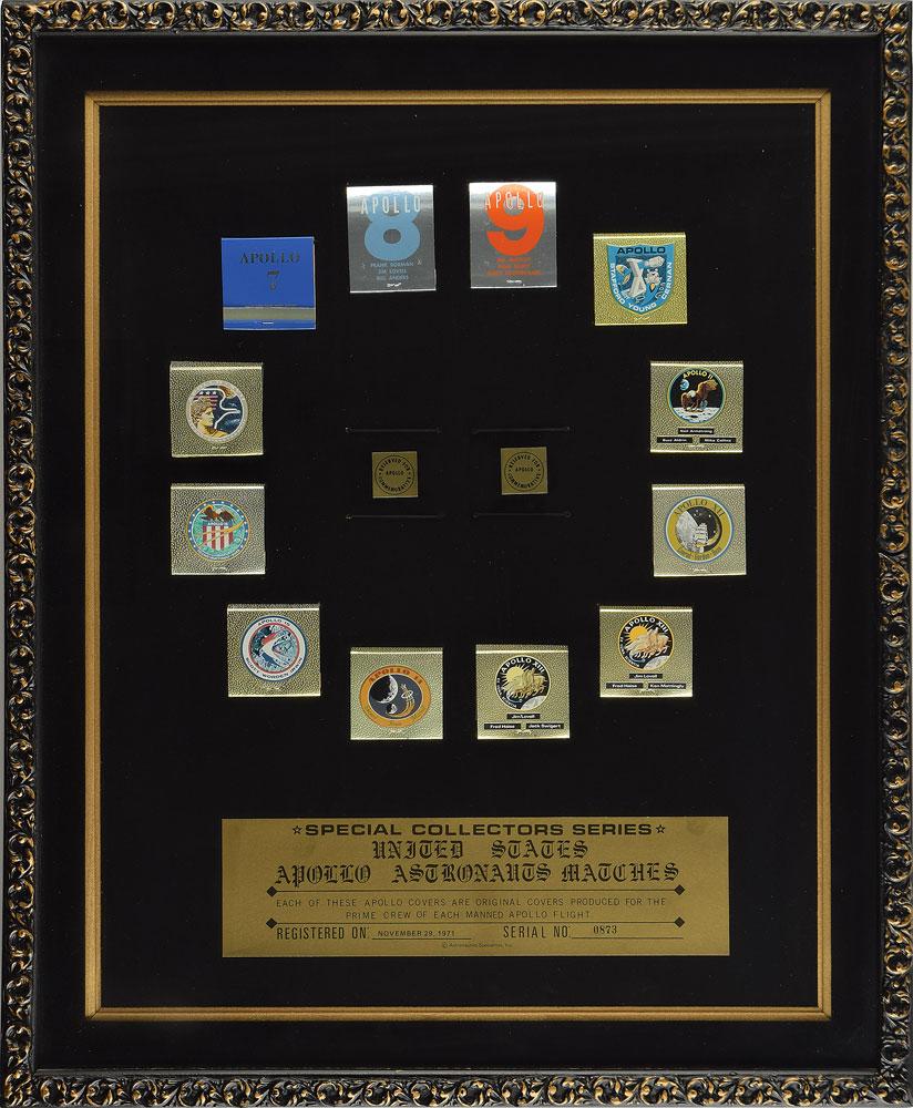 Uncommon matchbook display commemorating the Apollo program, consisting of twelve unused matchbooks for Apollo missions 7 through 17, with two for the Apollo 13 mission. The covers for Apollos 10 through 17 feature the respective mission emblem. Each matchbook approximately measures 2 x 2, and are mounted and framed with an Astronautics Specialties information sheet to an overall size of 19.5 x 23.5. The sheet reads, in part: "Each of these Apollo covers are original covers produced for the prime crew of each manned Apollo flight. Registered on: November 29, 1971, Serial No: 0873." Center of display reserved for additional matchbooks. Frame backing retains the original Astronautics Specialities, Inc., label. In fine condition.