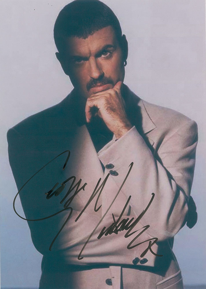 Color glossy 8.5 x 11.75 lightweight photo of Michael facing the camera in a handsome half-length pose, signed in black felt tip, "George Michael, x." In fine condition, with a small scuff to the lower right.