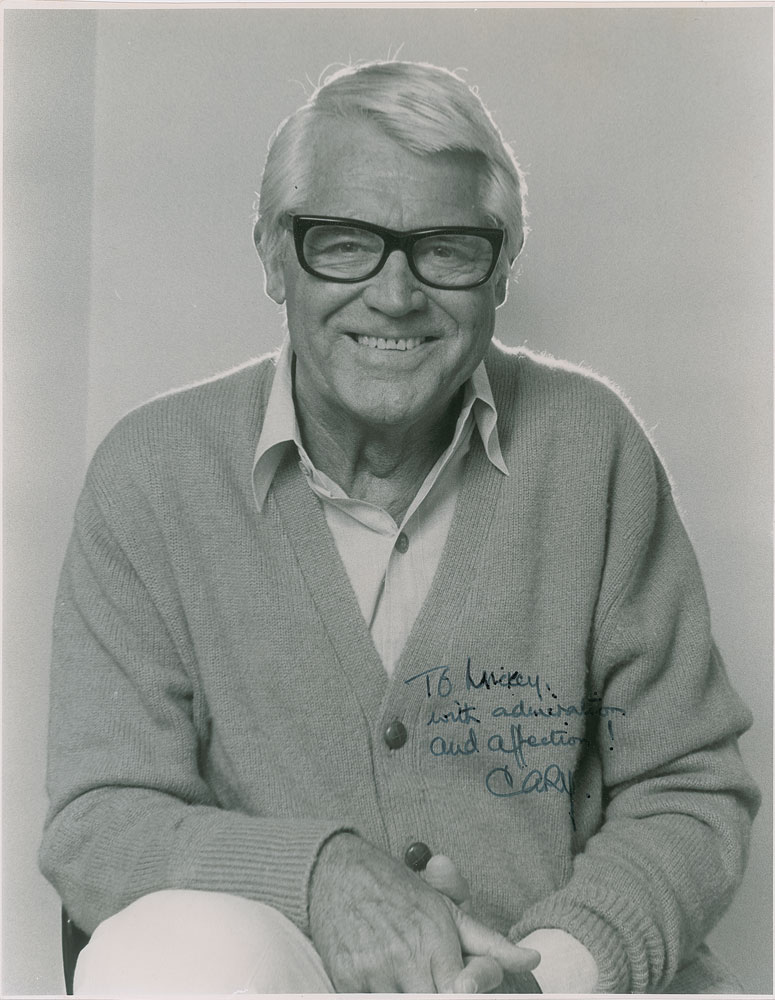 Satin-finish 10.5 x 13.75 photo of the handsome leading man in later age, signed and inscribed to acting legend Mickey Rooney in black felt tip, "To Mickey, with admiration and affection! Cary.” Also signed on the reverse in felt tip by Rooney. In fine condition.