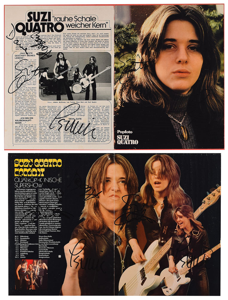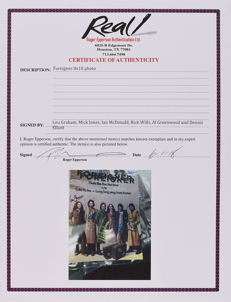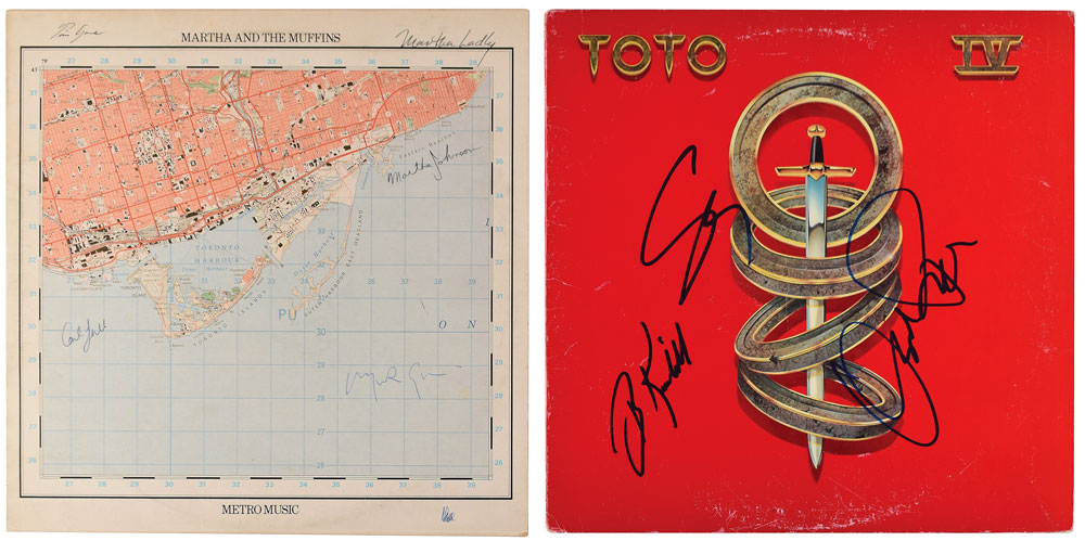 Six items signed by members of notable North American rock groups: a color glossy 8 x 10 photo of Foreigner (Al Greenwood, Dennis Elliott, Ed Gagliardi, Ian McDonald, Mick Jones, and Lou Gramm); Toto IV promotional album by Toto (David Paich, Steve Lukather, and Bobby Kimball); a Metro Music album by Martha and the Muffins (Martha Johnson, Martha Ladly, Mark Gane, Carl Finkle, Tim Gane, and Andy Haas); a DS related to Martha and the Muffins, dated November 1, 1982 (signed twice by Johnson and Gane); and two color German magazine photos of Suzi Quatro and her band (Quatro (4), Len Tuckey (3), Alastair McKenzie (2), and Dave Neal, who also signs twice). In overall very good to fine condition. The Toto record is not included. Accompanied by a full letter of authenticity from REAL for the Foreigner photo (erroneously identifying Ed Gagliardi as Rick Willis).