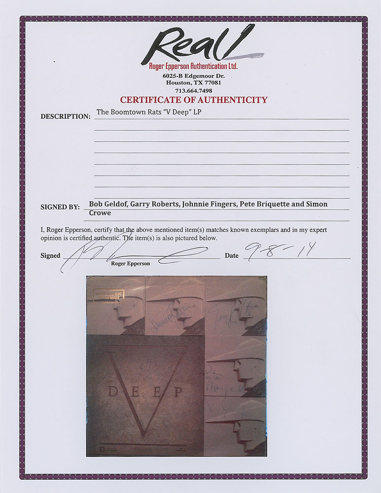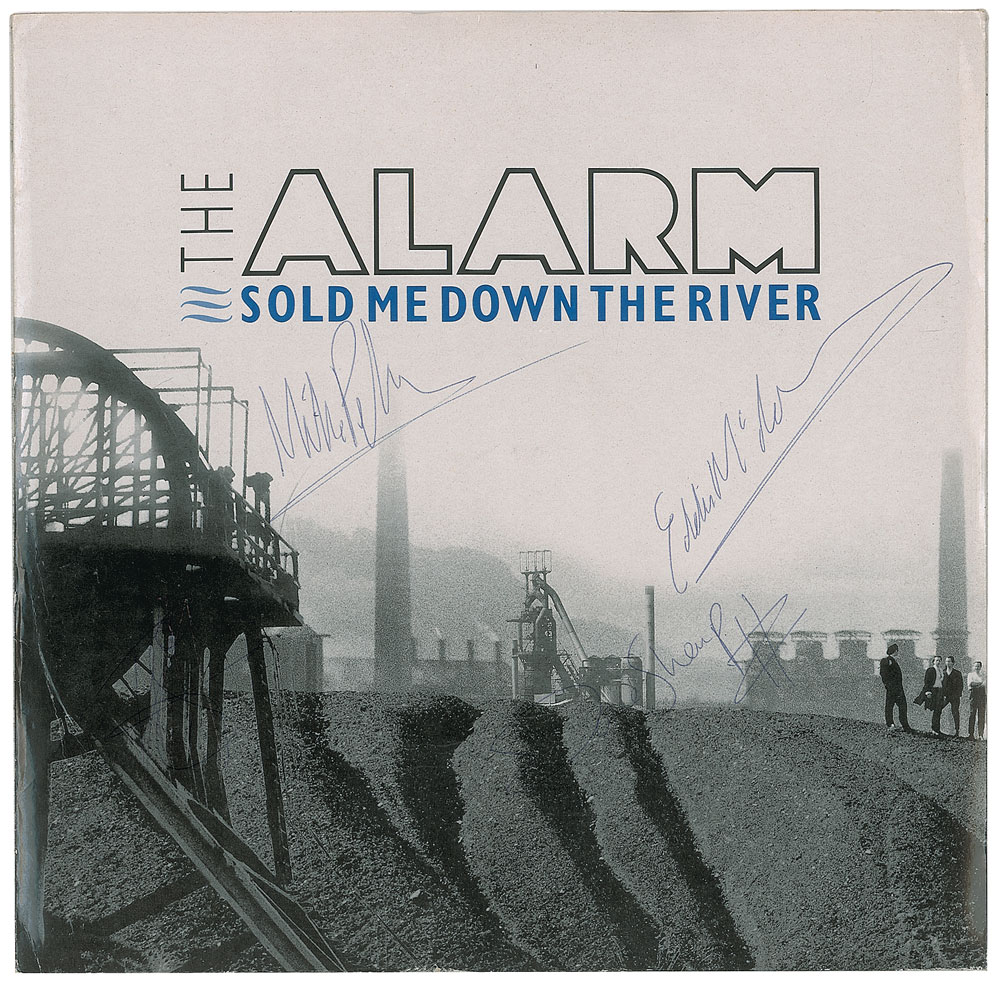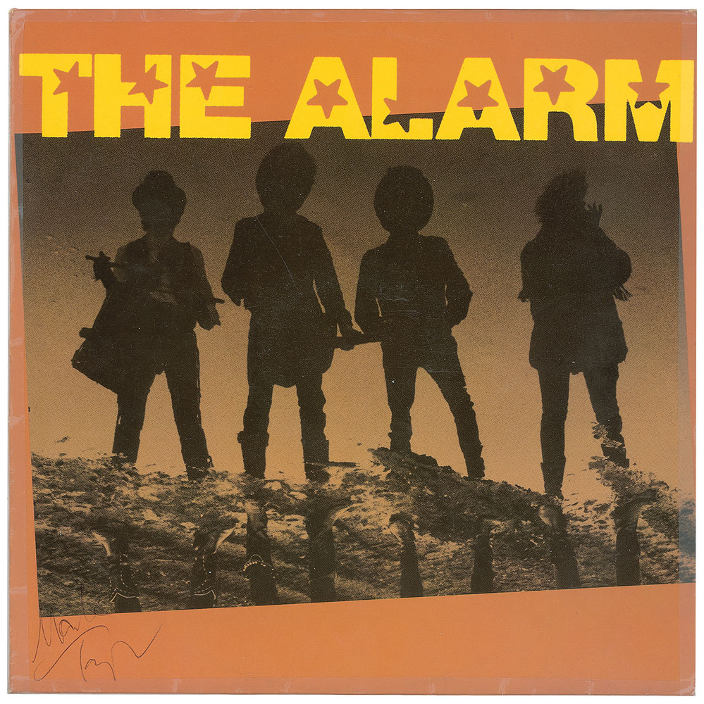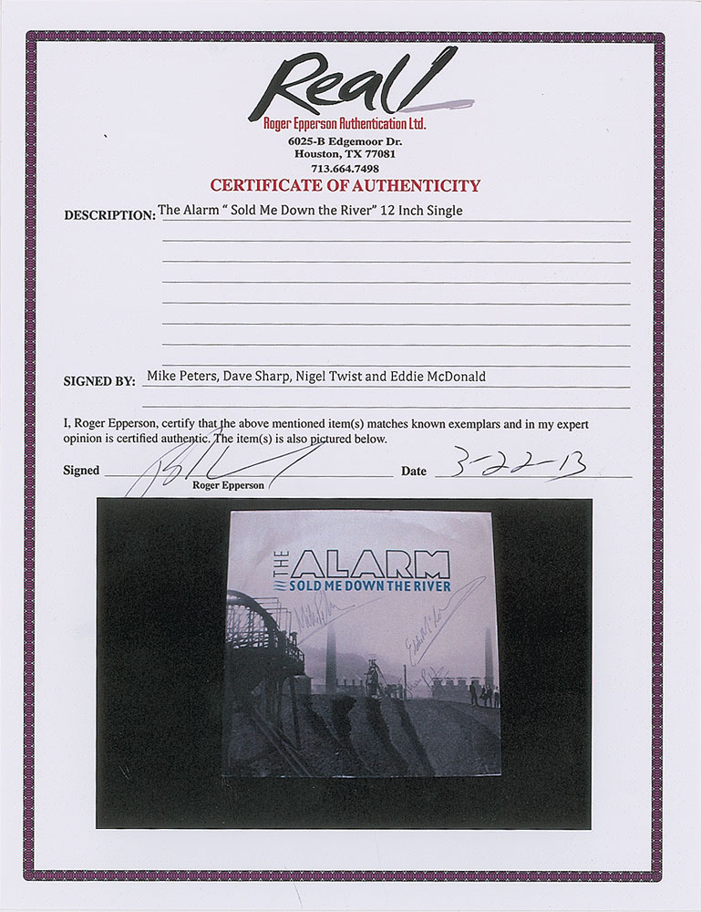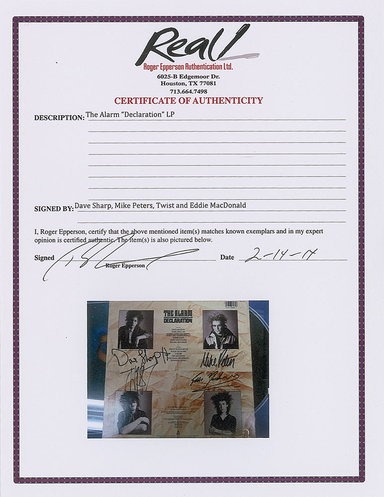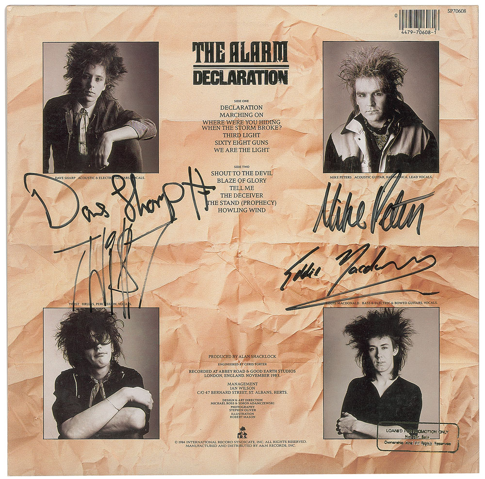 Collection of 13 items signed by members of eight notable UK rock bands, including: three albums by The Alarm—Declaration promo, self-titled EP, and Sold Me Down the River—each signed by Mike Peters, Dave Sharp, Eddie Macdonald, and Twist; V Deep promo album by The Boomtown Rats (Bob Geldof, Garry Roberts, Johnny Fingers, Pete Briquette, and Simon Crowe); Love Removal Machine single album by The Cult (Ian Astbury and Billy Duffy); Reach the Beach album by The Fixx (Cy Curnin, Rupert Greenall, Jamie West-Oram, Adam Woods, and Dan K. Brown); three items from The Mighty Lemon Drops—'Out of Hand' EP (Paul Marsh, Dave Newton, Tony Linehan, and Keith Rowley), a World Without End album (Marsh, Newton, Linehan, and Rowley), and a Happy Head promotional album (Marsh, Newton, Rowley, and Marcus Williams); a Grin & Bear It album and a 45 RPM single record for 'Babylon's Burning / Society' by The Ruts, both signed by David Ruffy, John Jennings, and Paul Fox, with the single also signed by Malcolm Owen; Just Supposin' album by Status Quo (Francis Rossi, Rick Parfitt, Alan Lancaster, John Coghlan, and Andy Bown; and a promotional postcard photo of The Tourists (Dave Stewart, Eddie Chin, Jim Toomey, Peet Coombes, and Annie Lennox. In overall very good to fine condition. The records are not included. Accompanied by 10 full letters of authenticity from JSA and REAL.