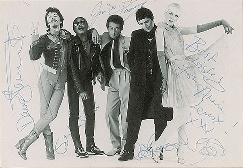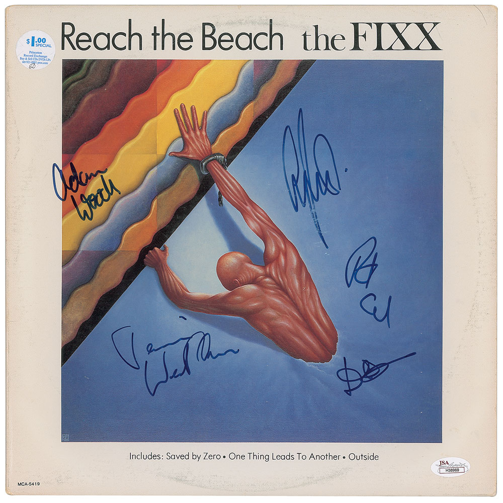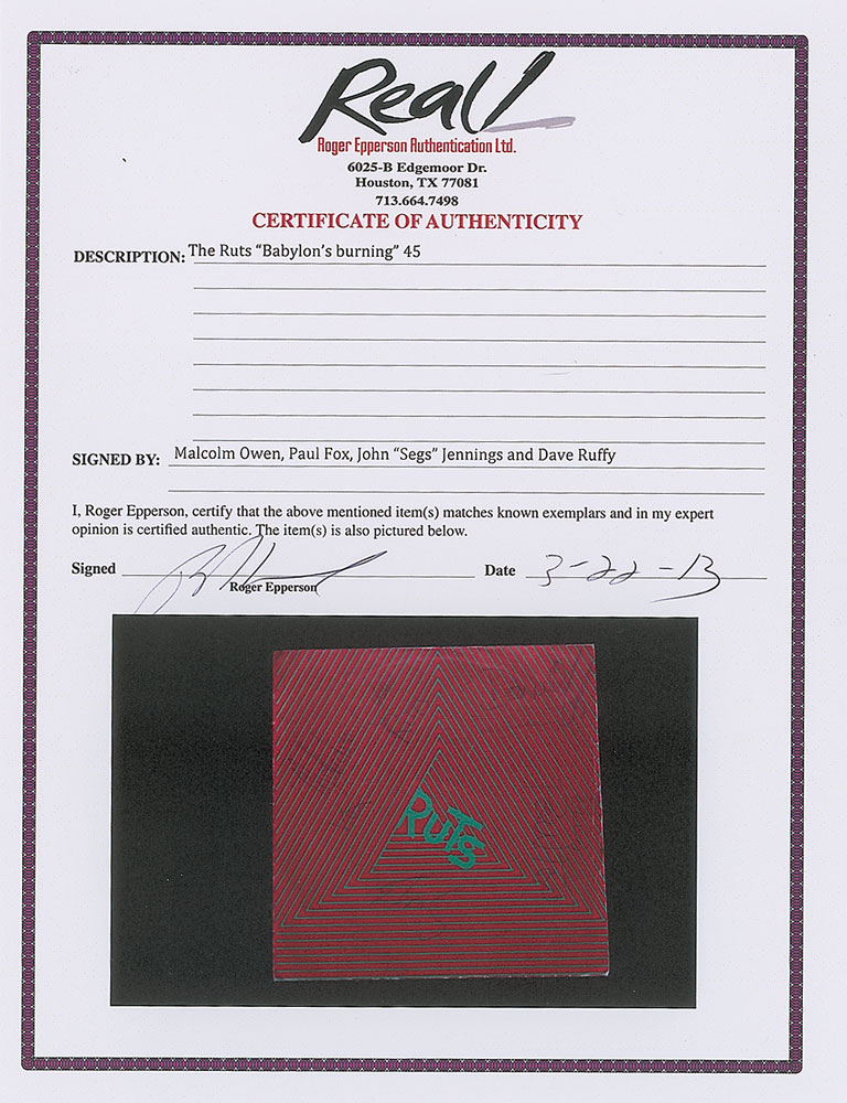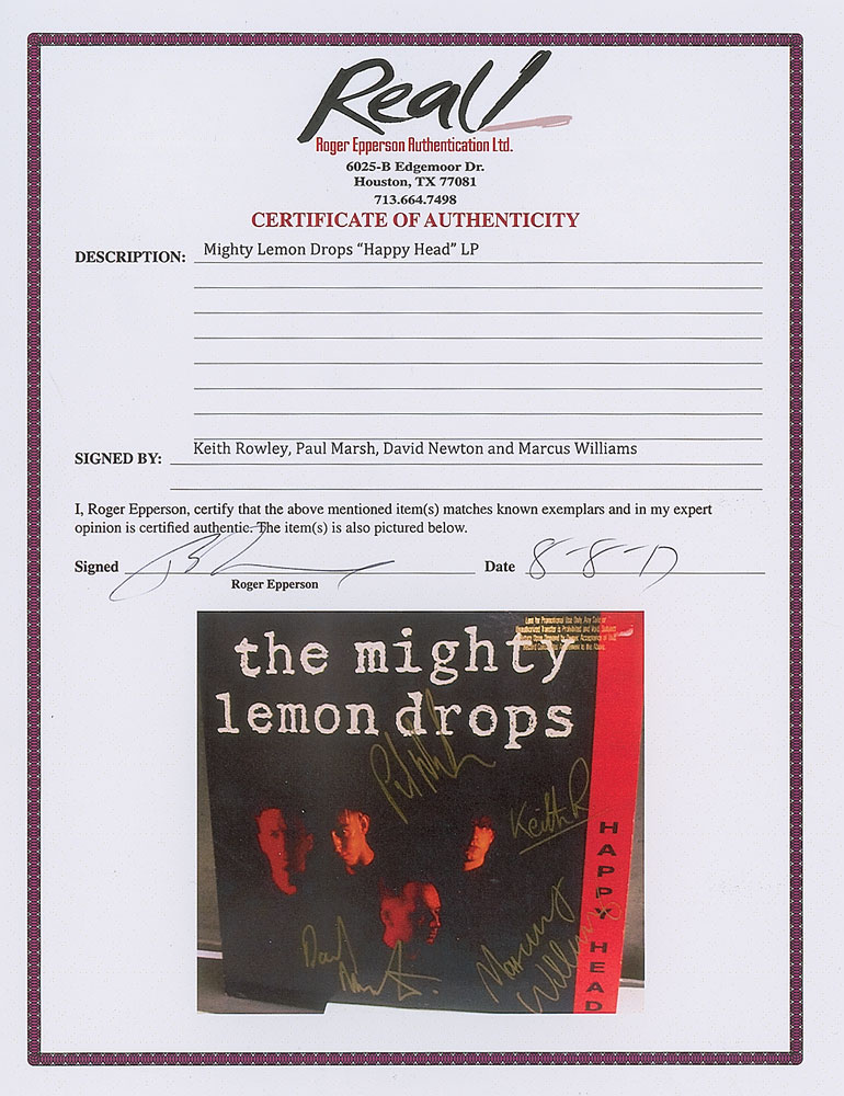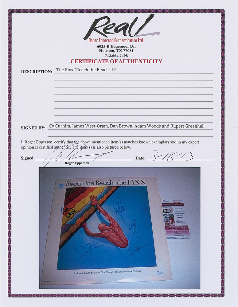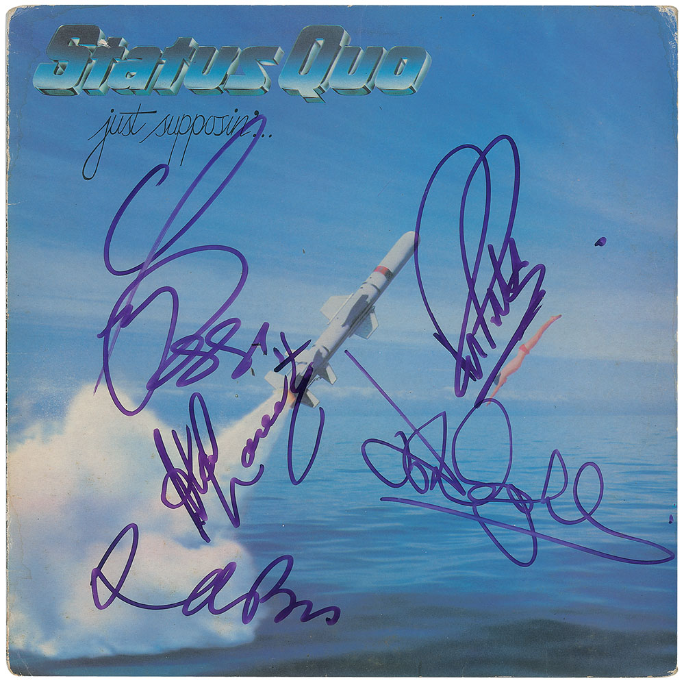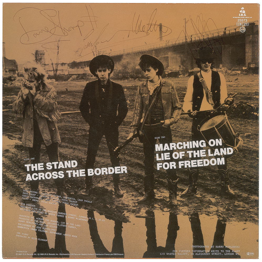 Collection of 13 items signed by members of eight notable UK rock bands, including: three albums by The Alarm—Declaration promo, self-titled EP, and Sold Me Down the River—each signed by Mike Peters, Dave Sharp, Eddie Macdonald, and Twist; V Deep promo album by The Boomtown Rats (Bob Geldof, Garry Roberts, Johnny Fingers, Pete Briquette, and Simon Crowe); Love Removal Machine single album by The Cult (Ian Astbury and Billy Duffy); Reach the Beach album by The Fixx (Cy Curnin, Rupert Greenall, Jamie West-Oram, Adam Woods, and Dan K. Brown); three items from The Mighty Lemon Drops—'Out of Hand' EP (Paul Marsh, Dave Newton, Tony Linehan, and Keith Rowley), a World Without End album (Marsh, Newton, Linehan, and Rowley), and a Happy Head promotional album (Marsh, Newton, Rowley, and Marcus Williams); a Grin & Bear It album and a 45 RPM single record for 'Babylon's Burning / Society' by The Ruts, both signed by David Ruffy, John Jennings, and Paul Fox, with the single also signed by Malcolm Owen; Just Supposin' album by Status Quo (Francis Rossi, Rick Parfitt, Alan Lancaster, John Coghlan, and Andy Bown; and a promotional postcard photo of The Tourists (Dave Stewart, Eddie Chin, Jim Toomey, Peet Coombes, and Annie Lennox. In overall very good to fine condition. The records are not included. Accompanied by 10 full letters of authenticity from JSA and REAL.