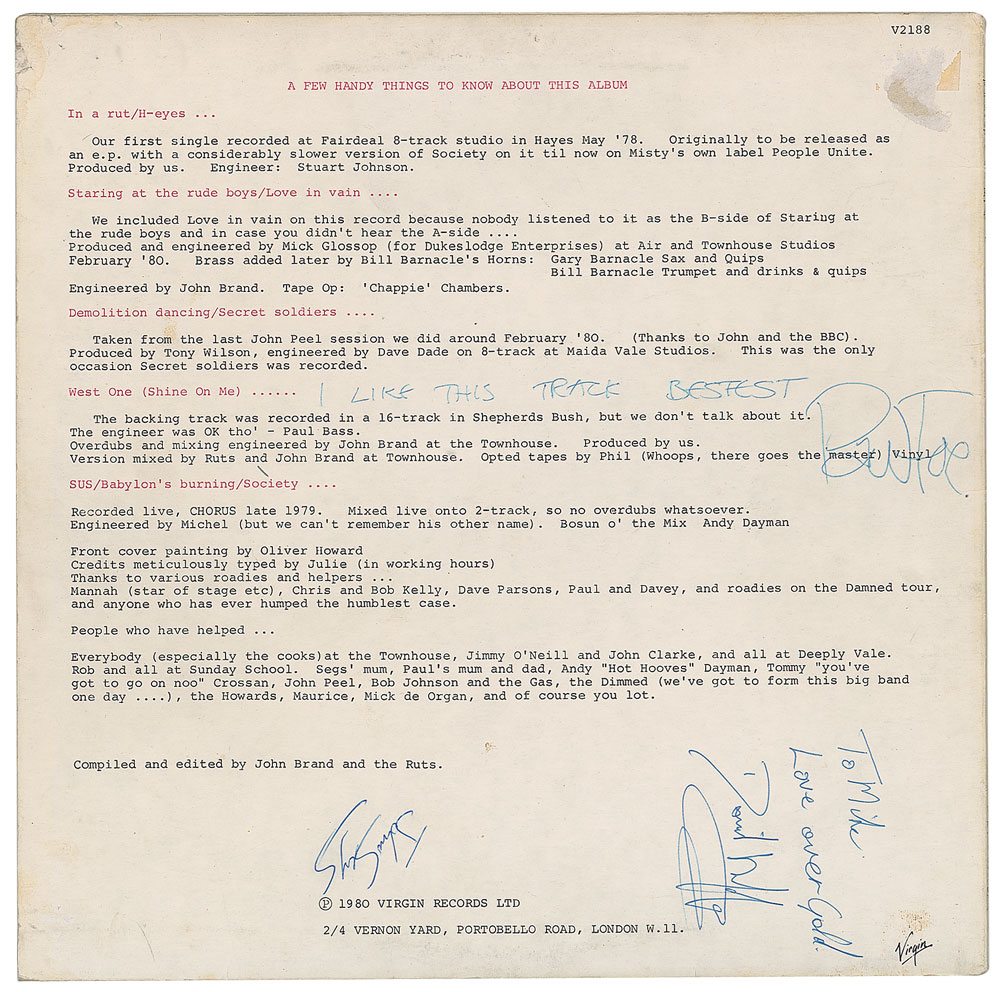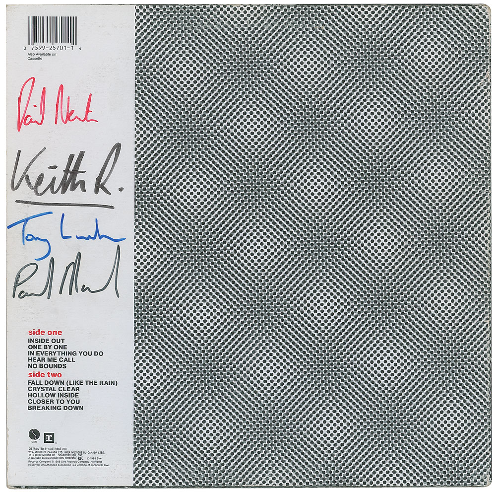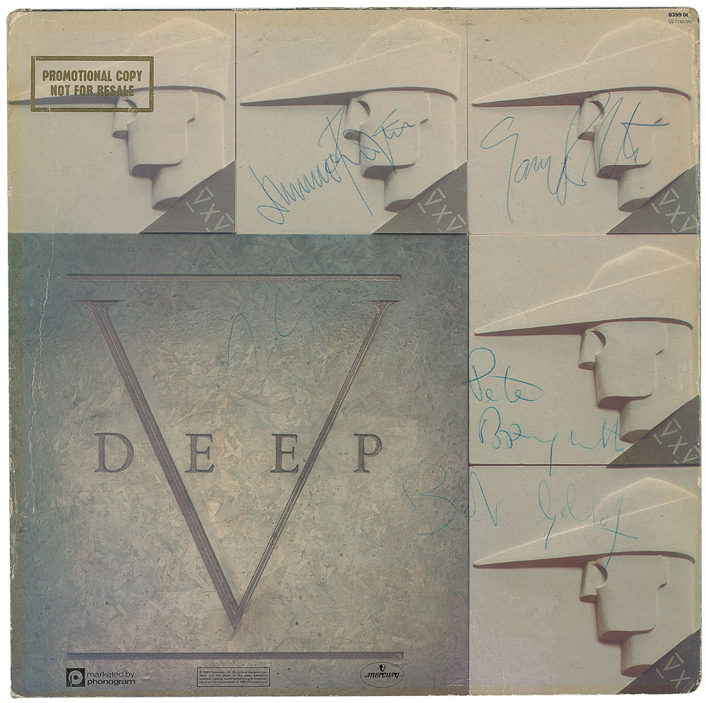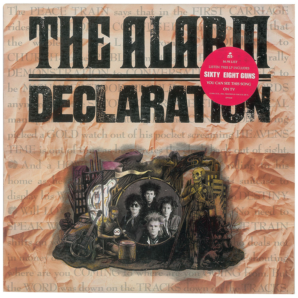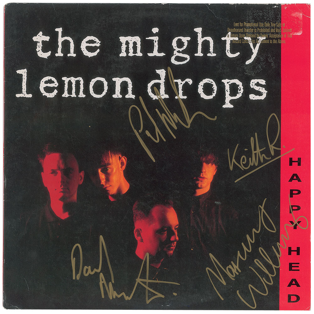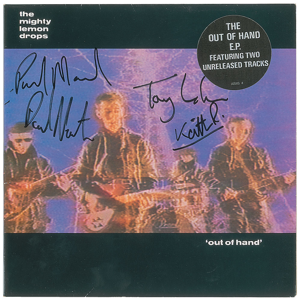 Collection of 13 items signed by members of eight notable UK rock bands, including: three albums by The Alarm—Declaration promo, self-titled EP, and Sold Me Down the River—each signed by Mike Peters, Dave Sharp, Eddie Macdonald, and Twist; V Deep promo album by The Boomtown Rats (Bob Geldof, Garry Roberts, Johnny Fingers, Pete Briquette, and Simon Crowe); Love Removal Machine single album by The Cult (Ian Astbury and Billy Duffy); Reach the Beach album by The Fixx (Cy Curnin, Rupert Greenall, Jamie West-Oram, Adam Woods, and Dan K. Brown); three items from The Mighty Lemon Drops—'Out of Hand' EP (Paul Marsh, Dave Newton, Tony Linehan, and Keith Rowley), a World Without End album (Marsh, Newton, Linehan, and Rowley), and a Happy Head promotional album (Marsh, Newton, Rowley, and Marcus Williams); a Grin & Bear It album and a 45 RPM single record for 'Babylon's Burning / Society' by The Ruts, both signed by David Ruffy, John Jennings, and Paul Fox, with the single also signed by Malcolm Owen; Just Supposin' album by Status Quo (Francis Rossi, Rick Parfitt, Alan Lancaster, John Coghlan, and Andy Bown; and a promotional postcard photo of The Tourists (Dave Stewart, Eddie Chin, Jim Toomey, Peet Coombes, and Annie Lennox. In overall very good to fine condition. The records are not included. Accompanied by 10 full letters of authenticity from JSA and REAL.