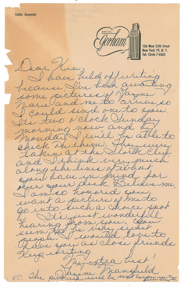 Two letters: an ALS, one page, 6 x 9.5, Hotel Gorham letterhead, postmarked February 27, 1956, addressed to Ken Browne, in part: "I've been awaiting some pictures of Jayne Marie and me to arrive so I could send one to you.They were taken at the Stork Club, and I think very much along the lines of what you have in mind for over your desk," with Mansfield adding a postscript: "The pictures will be sent to you in a few days"; and a TLS, one page, 6 x 9.5, Hotel Gorham letterhead, April 16, 1956, forwarding two pictures to Browne as promised, with Mansfield signing "Jayne" to a postscript: "I as yet have not received the picture of Jayne Marie and me at the Stork Club. If you would like it, please write to the Stork Club." In overall very good to fine condition, with chipping an tears to the edges, and a block of toning to the handwritten letter. Accompanied by the original mailing envelope for the handwritten letter.