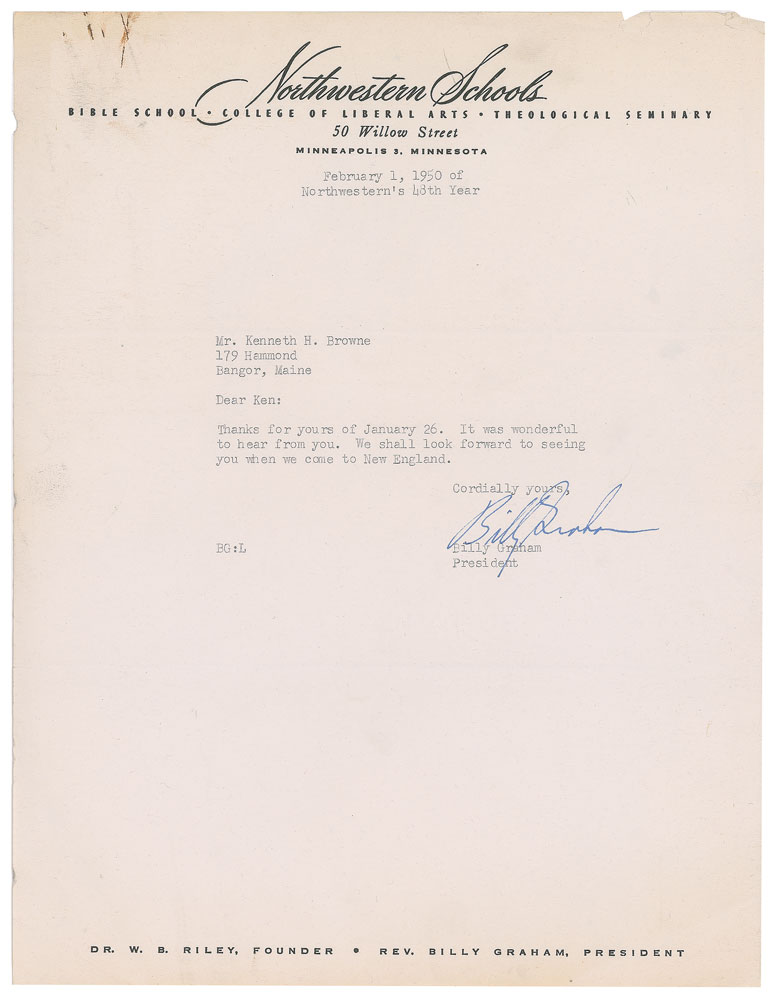 TLS, one page, 8.5 x 11, Northwestern Schools letterhead, February 1, 1950. Letter to Ken Browne, in full: "Thanks for yours of January 26. It was wonderful to hear from you. We shall look forward to seeing you when we come to New England." In very good to fine condition, with short tears to the top edge, and rusty paperclip impressions to the upper left corner. Accompanied by the original mailing envelope, as well as a 78 RPM photograph record from 1952, 'The Billy Graham Family Gathered Around the Hearth / Billy Graham's Message to the Radio and Television Audience.'