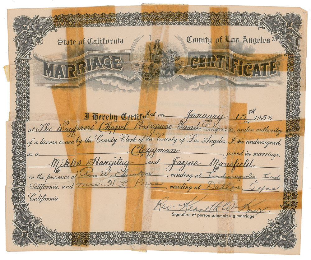 Partly-printed DS, one page, 8.5 x 7, January 13, 1958. A State of California, County of Los Angeles marriage certificate confirming that Miklos Hargitay and Jayne Mansfield were married by Reverend Kenneth W. Knox at the Wayfarers Chapel in Portuguese Bend, California, on January 13, 1958. Signed at the conclusion by the clergyman. Typed collector's notations on reverse read: "From the wastebasket of Jayne Mansfield—Sunset Boulevard, Given to us by Bud Lane, December 31, 1964." In good condition, with old clear tape, and tape stains, to the multiple tears.