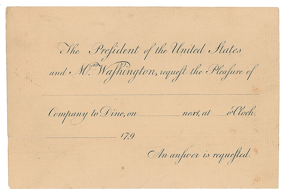 Unissued partly-printed dinner invitation from the administration of President George Washington, one page, 5.75 x 3.75, circa 1790-1797. The elegant black text reads, in full: "The President of the United States and Mrs. Washington, request the Pleasure of?Company to Dine, on?next, at?o'Clock?179?An answer is requested." In fine condition.