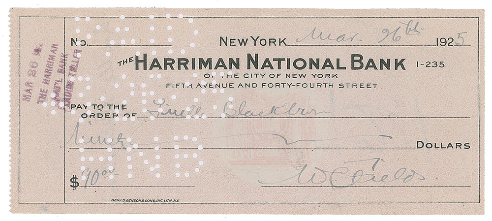 The Harriman National Bank check, 6.25 x 2.75, filled out and signed by W. C. Fields, payable to stage actress Linelle Blackburn for $10, March 26, 1925. In very good to fine condition, with fading to the ink, and a crease to the upper right corner.