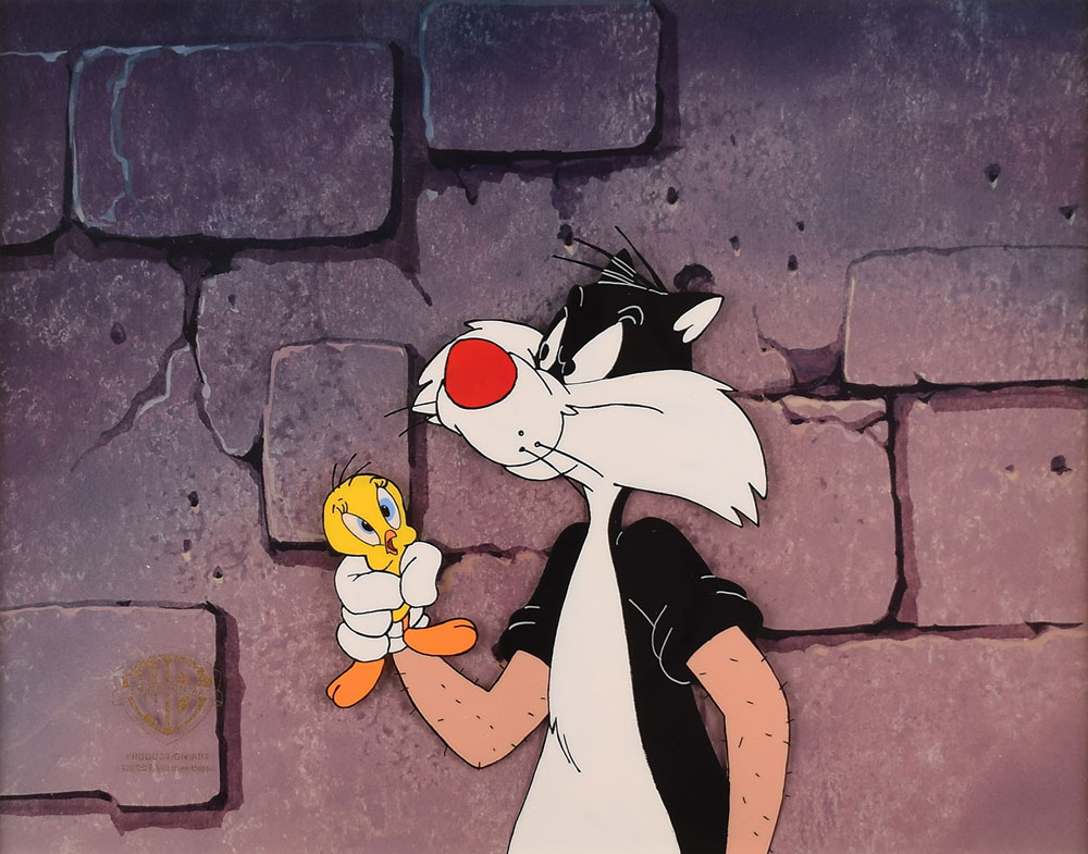 (Warner Brothers Studios, 1996) Original production cel of Sylvester the cat and Tweety from the animated television series The Sylvester and Tweety Mysteries, which depicts Sylvester, with sleeves rolled up, holding the alarmed canary in the season two episode 'Don't Polka Me.' The cel is placed on a matching studio copy background, with image measuring 4 x 5.5, and a mat opening of 9.5 x 7.5. Lower left features the golden Warner Bros. Animation Art seal. Framed to an overall size of 17.5 x 15.5. In fine condition. Accompanied by a certificate of authenticity from Warner Bros.