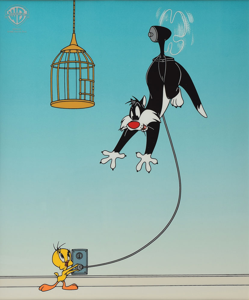 Limited edition color 10 x 12 Warner Bros. serigraph cel entitled 'Sylvester Unplugged,' numbered 2241/2500, which shows Sylvester, a motorized fan attached his back, going airborne as Tweety, cord plug in hand, watches gleefully from below his empty cage. Upper left corner features a Warner Bros. Animation Art stamp. Double-matted and framed to an overall size of 17.25 x 19.25. In very fine condition.