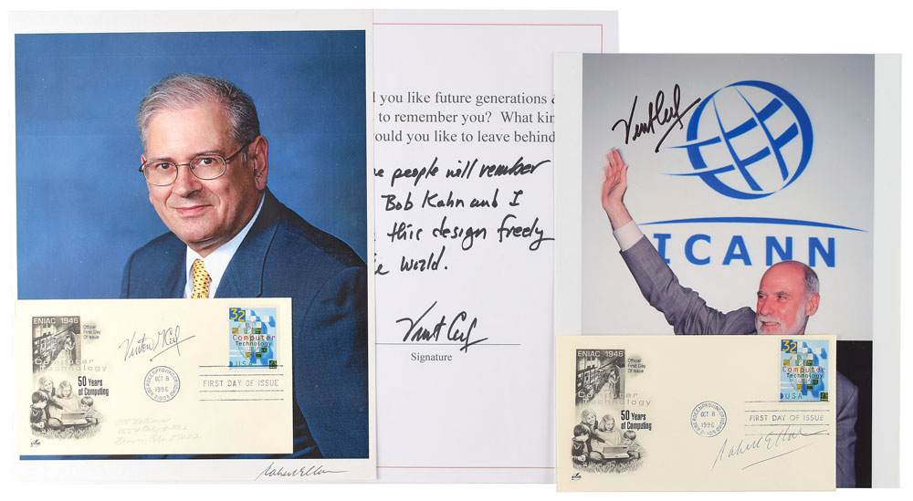 Five items: a color satin-finish 8 x 10 photo of Cerf waving at an ICANN conference, signed in black felt tip, "Vint Cerf"; a color semi-glossy 8.5 x 11 laserprint photo of Bob Kahn, signed in the lower border in black ballpoint, "Robert E. Kahn"; a pair of FDCs with cachets honoring 50 years of computer technology, individually signed in black ballpoint, "Vinton Cerf" and "Robert E. Kahn"; and an AQS on a white 8.5 x 11 sheet with typed question asking Cerf how he would like future generations and biographers to remember him; Cerf's response: "I hope people will remember that Bob Kahn and I gave this design freely to the world." In overall fine condition.