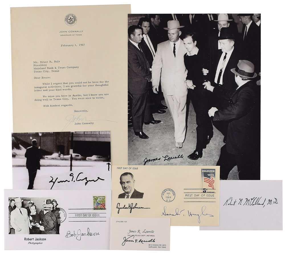 Group lot of seven items signed by figures associated with the assassination of President John F. Kennedy, including: Texas Governor John Connally (TLS), Judge Sarah T. Hughes (FDC), Photographer Robert Jackson (FDC), Detective James R. Leavelle (2; SP and business card), Dr. Robert McClelland (signature), and James Tague (SP), a bystander injured by concrete debris from a street curb struck by the assassin's bullet. In overall fine condition.