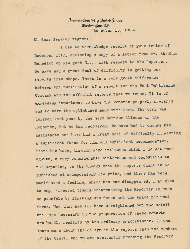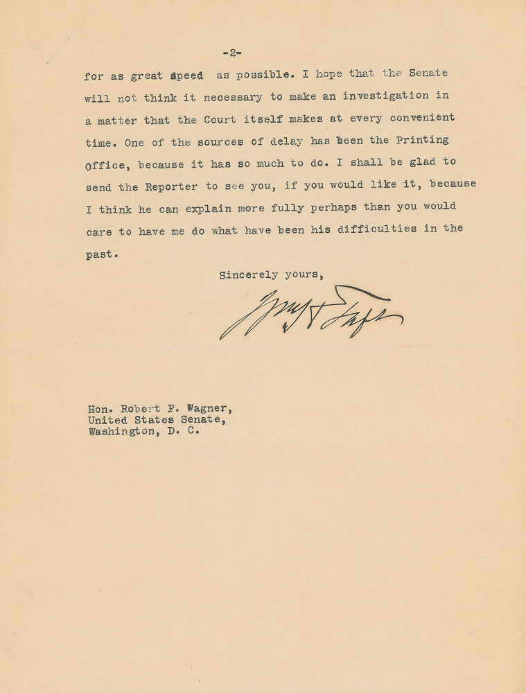 TLS signed “Wm. H. Taft,” two pages, 8 x 10.5, Supreme Court letterhead, December 15, 1928. Letter to Senator Robert F. Wagner, in part: "There is a very great difference between the publication of a report for the West Publishing Company and the official reports that we issue. It is of exceeding importance to have the reports properly prepared and to have the syllabuses made with care. The work was delayed last year by the very serious illness of the Reporter, but he has recovered. We have had to change his assistants and have had a great deal of difficulty in getting a sufficient force for him and sufficient accommodation. There has been, through some influence which I do not recognize, a considerable bitterness and opposition to the Reporter, on the theory that the reports ought to be furnished at an impossibly low price, and there has been manifested a feeling, which has now disappeared, I am glad to say, directed toward embarrassing the Reporter as much as possible by limiting his force and the space for that force. Now that has all been straightened out. The detail and care necessary in the preparation of these reports are hardly realized by the ordinary practitioner. No one knows more about the delays in the reports than the members of the Court, and we are constantly pressing the Reporter for as great speed as possible. I hope that the Senate will not think it necessary to make an investigation in a matter that the Court itself makes at every convenient time. One of the sources of delay has been the Printing Office, because it has so much to do. I shall be glad to send the Reporter to see you, if you would like it, because I think he can explain more fully perhaps than you could care to have me do what have been his difficulties in the past." In fine condition, with two pin holes to the upper left corner.