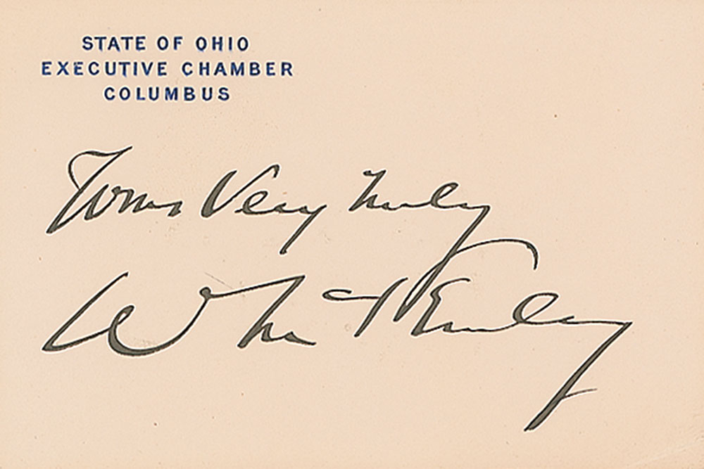 Attractive official "State of Ohio, Executive Chamber, Columbus" card, 4.25 x 2.75, boldly signed in ink, "Yours Very Truly, W. McKinley." In fine condition, with a small crease to the lower right corner.