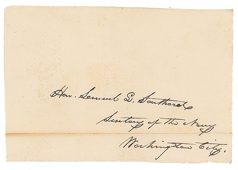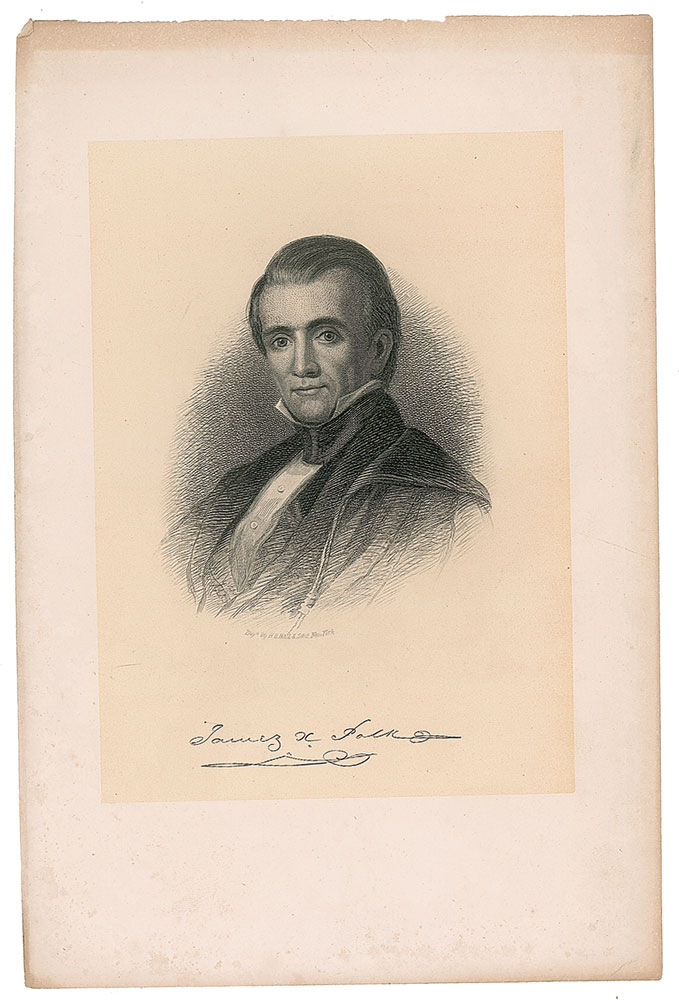 Hand-addressed mailing panel by James K. Polk, 5 x 3.25, filled out in Polk's hand: "Hon. Samuel S. Southard, Secretary of the Navy, Washington City." In fine condition, with light toning along the horizontal fold. Accompanied by an engraved portrait bearing a facsimile signature. Southard served as Secretary of the Navy from 1823-1829, under Presidents Madison and Monroe.