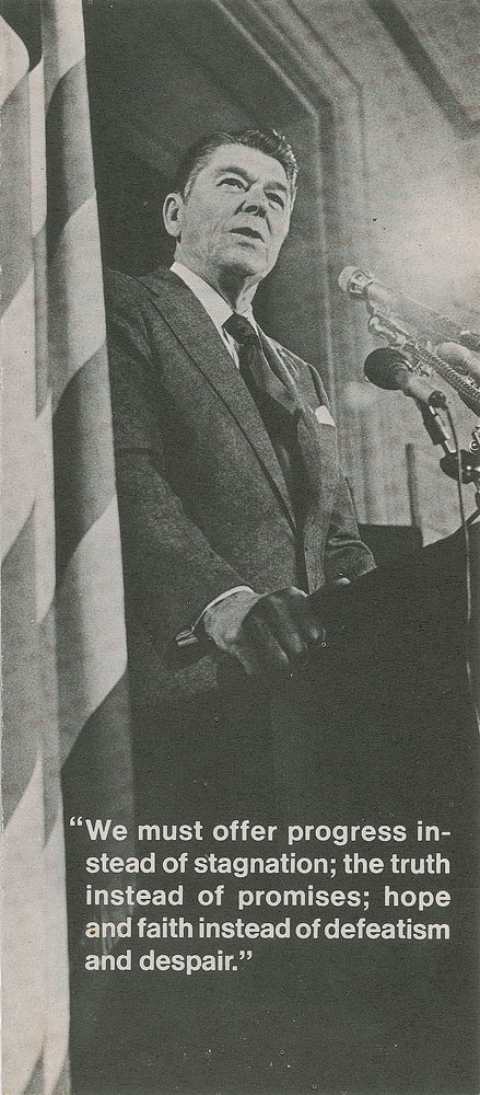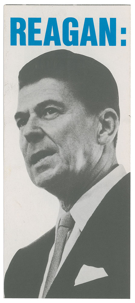 Tri-fold flyer from Reagan's presidential campaign entitled "Reasons for Reagan," 4 x 9, signed on the front in black felt tip by Ronald Reagan, and in blue ballpoint by his son, Ron Reagan. In fine condition. Accompanied by two different unsigned campaign flyers.