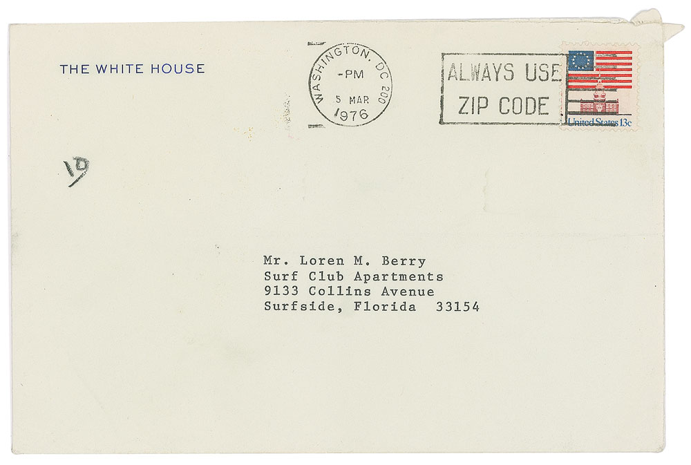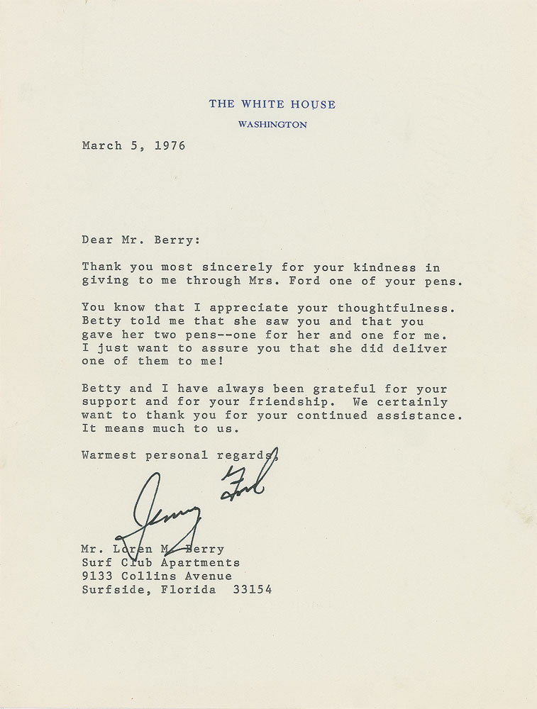 TLS as president signed “Jerry Ford,” one page, 6.75 x 8.75, White House letterhead, March 5, 1976. Letter to Loren M. Berry, in part: "Thank you most sincerely for your kindness in giving to me through Mrs. Ford one of your pens. You know that I appreciate your thoughtfulness. Betty told me that she saw you and that you gave her two pens—one for her and one for me. I just want to assure you that she did deliver one of them to me!" In fine condition, with a crease to the right edge, and a paperclip impression to the top edge. Accompanied by the original mailing envelope.