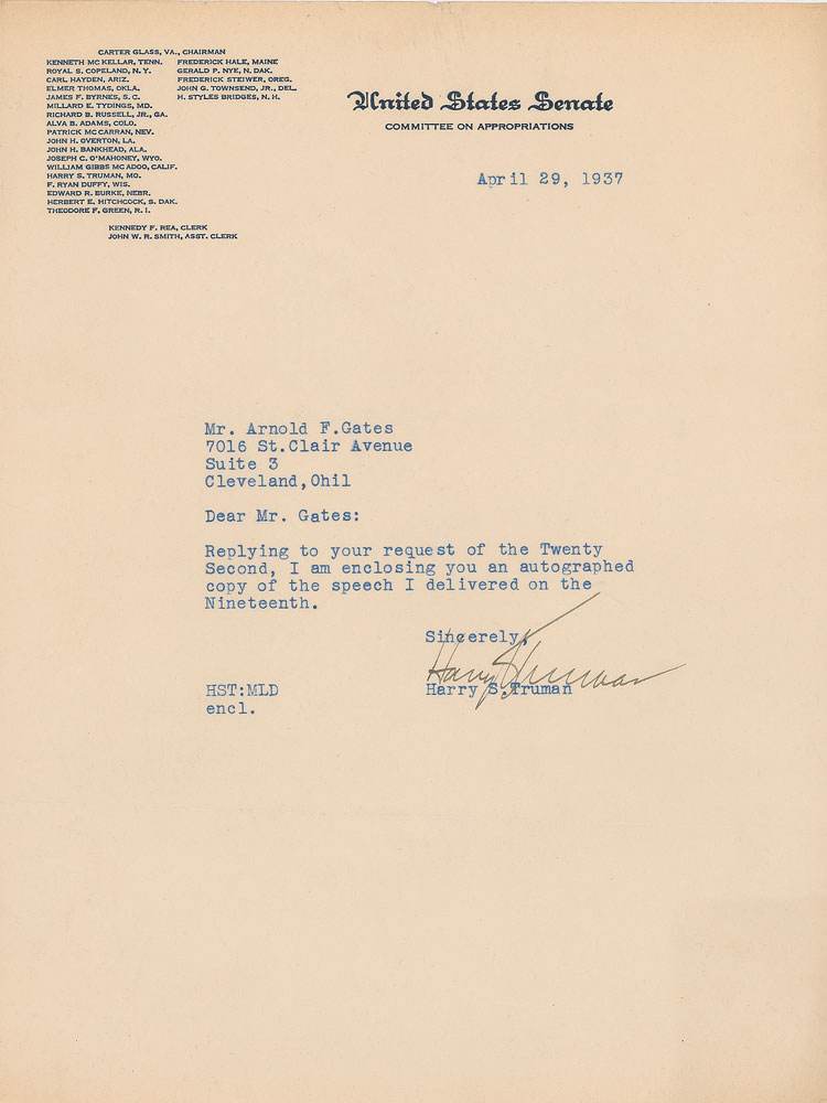 TLS, one page, 8 x 10.5, United States Senate letterhead, April 29, 1937. Letter to Arnold F. Gates, in full: "Replying to your request of the Twenty Second, I am enclosing you an autographed copy of the speech I delivered on the Nineteenth." In fine condition, with a small block of toning to the lower right corner. On April 19, 1937, Truman gave a speech on 'the controversy over the Supreme Court,' weighing in on President Franklin D. Roosevelt's efforts to 'pack the Court.' Truman concluded that, historically, justices had not turned out to be partisan ideologues—thus, 'the Court can't be packed,' and Truman supported FDR's plan.