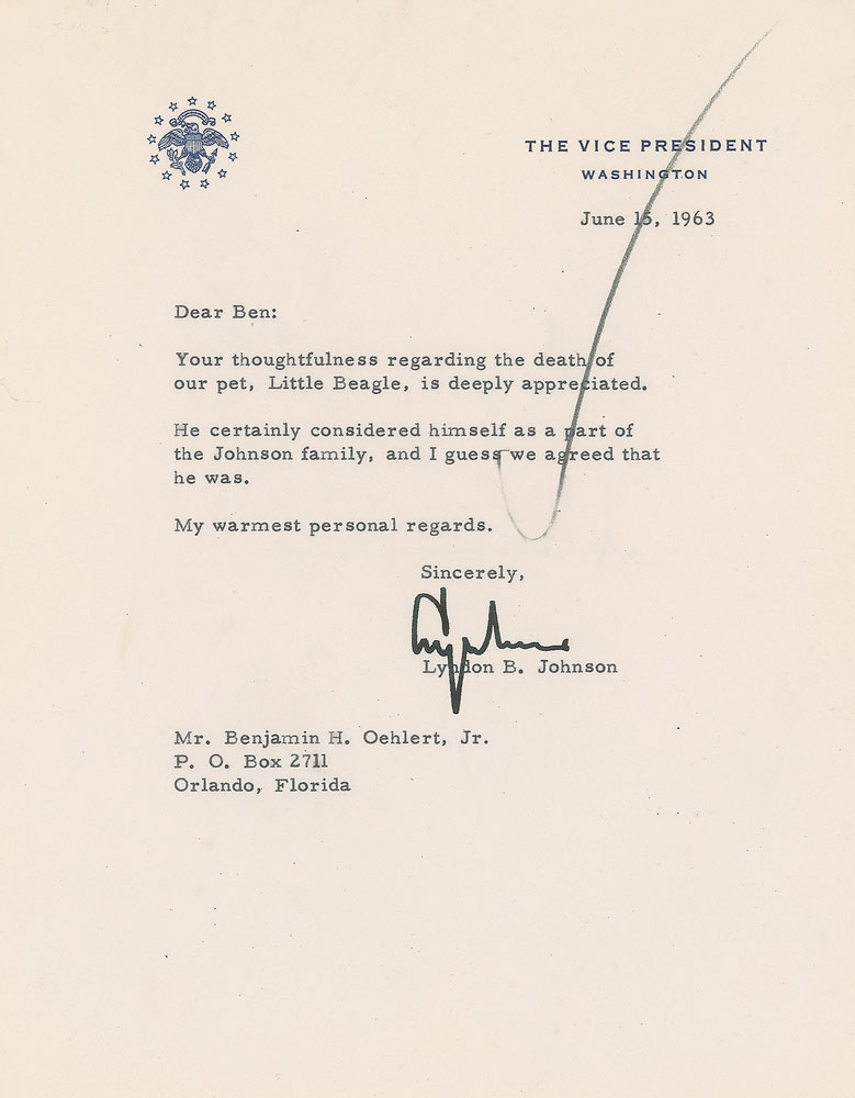 TLS signed “Lyndon,” one page, 7 x 9, The Vice President letterhead, June 15, 1963. Letter to Ben Oehlert, in part: "Your thoughtfulness regarding the death of our pet, Little Beagle, is deeply appreciated. He certainly considered himself as a part of the Johnson family, and I guess we agreed that he was." In fine condition.
