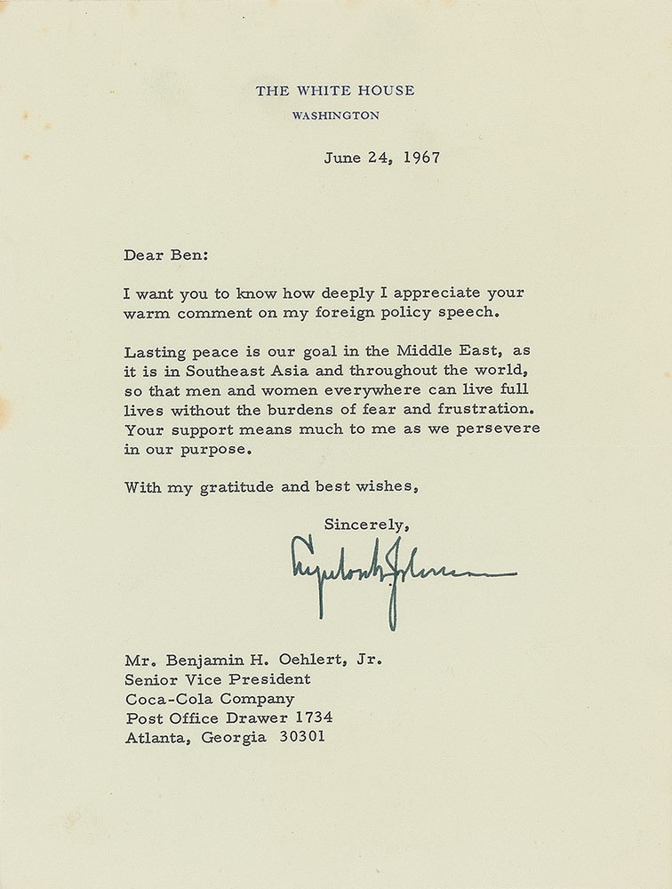 TLS as president, one page, 6.75 x 8.75, White House letterhead, June 24, 1967. Letter to Ben Oehlert, in part: "I want you to know how deeply I appreciate your warm comment on my foreign policy speech. Lasting peace is our goal in the Middle East, as it is in Southeast Asia and throughout the world, so that men and women everywhere can live full lives without the burdens of fear and frustration. Your support means much to me as we persevere in our purpose." In fine condition, with a few small stains to the left edge.