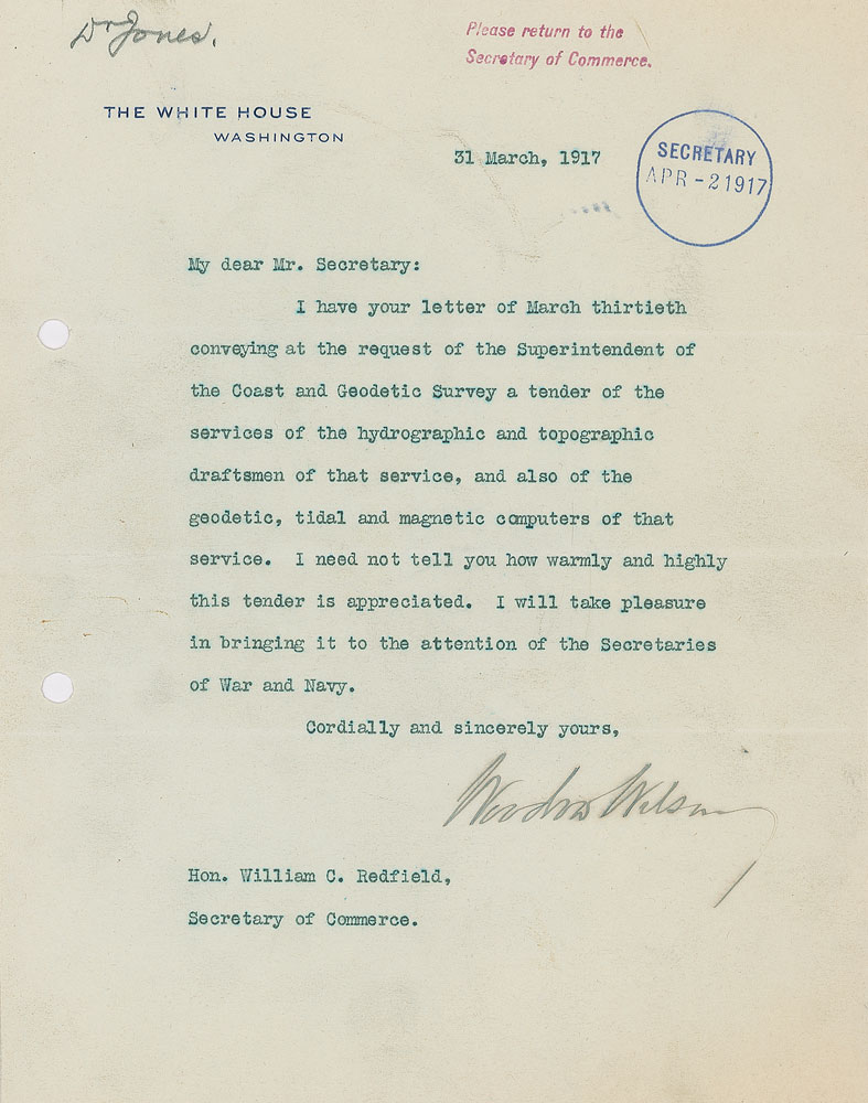 TLS as president, one page, 6.75 x 8.75, White House letterhead, March 31, 1917. Letter to Secretary of Commerce William C. Redfield, in full: "I have your letter of March thirtieth conveying at the request of the Superintendent of the Coast and Geodetic Survey a tender of the services of the hydrographic and topographic draftsmen of that service, and also of the geodetic, tidal and magnetic computers of that service. I need not tell you how warmly and highly this tender is appreciated. I will take pleasure in bringing it to the attention of the Secretaries of War and Navy." In very good to fine condition, with scattered light creasing, two extra horizontal folds, and two file holes to the left edge.