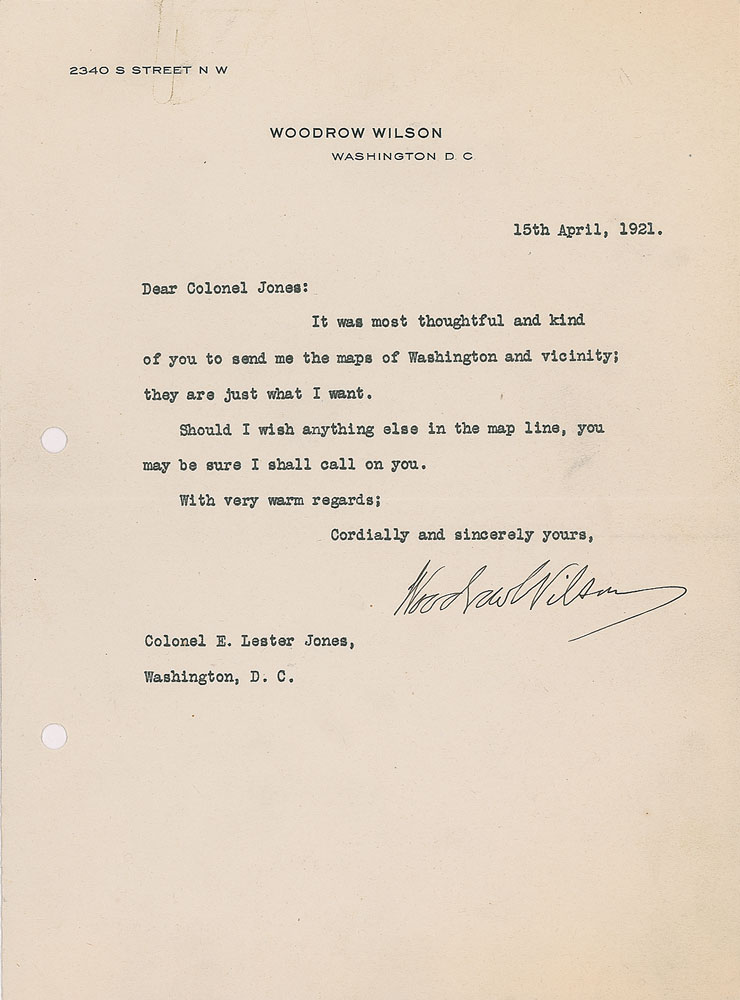 Two letters by Woodrow Wilson to E. Lester Jones: a TLS as president, one page, 7 x 8.75, White House letterhead, March 13, 1914, in part: "I take the liberty of dropping you just a line to express my interest in young Mr. Kuhn. I know you have thought of taking him with you on your trip this summer, and I want to say that I hope that you can find it possible to do so"; and a TLS, one page, 7 x 9.5, personal letterhead, April 4, 1921, in part: "It was most thoughtful and kind of you to send me the maps of Washington and vicinity; they are just what I want. Should I wish anything else in the map line, you may be sure I shall call on you." In fine condition, with two file holes to the left edge of each letter.