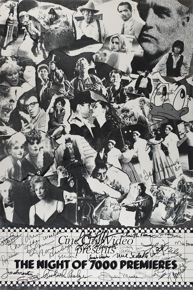 Unusual metallic 24 x 36 poster for the 1985 charity event 'The Night of 7000 Premieres,' which features a collage of various movie stars and entertainers, signed in black felt tip by several of those who attended, including: Christopher Reeve, Dustin Hoffman, Liza Minelli, Yoko Ono, Grand Master Flash, Woody Allen, Mia Farrow. Roy Scheider, Raquel Welch, Julia Meade, Neil Sedaka, Richard Belzer, Sylvia Miles, and more. Rolled and in fine condition.