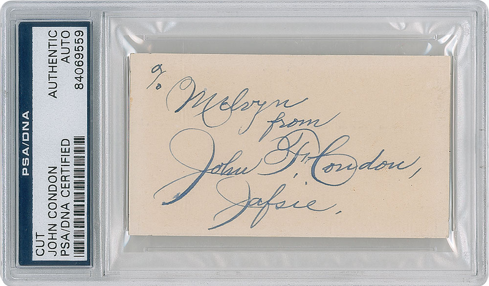 Bronx personality and retired school teacher (1860-1945) who was an integral part of the Lindbergh kidnapping negotiations. Vintage fountain pen signature and inscription, "To Melvyn, from, John F. Condon, Jafsie,” on an off-white 3.5 x 2 card. In fine condition. Accompanied by a glossy 8.5 x 6.5 photo featuring four images of Condon, with reverse featuring "Deceased" and "International News Photos" stamps, with an affixed newspaper obituary for Condon.