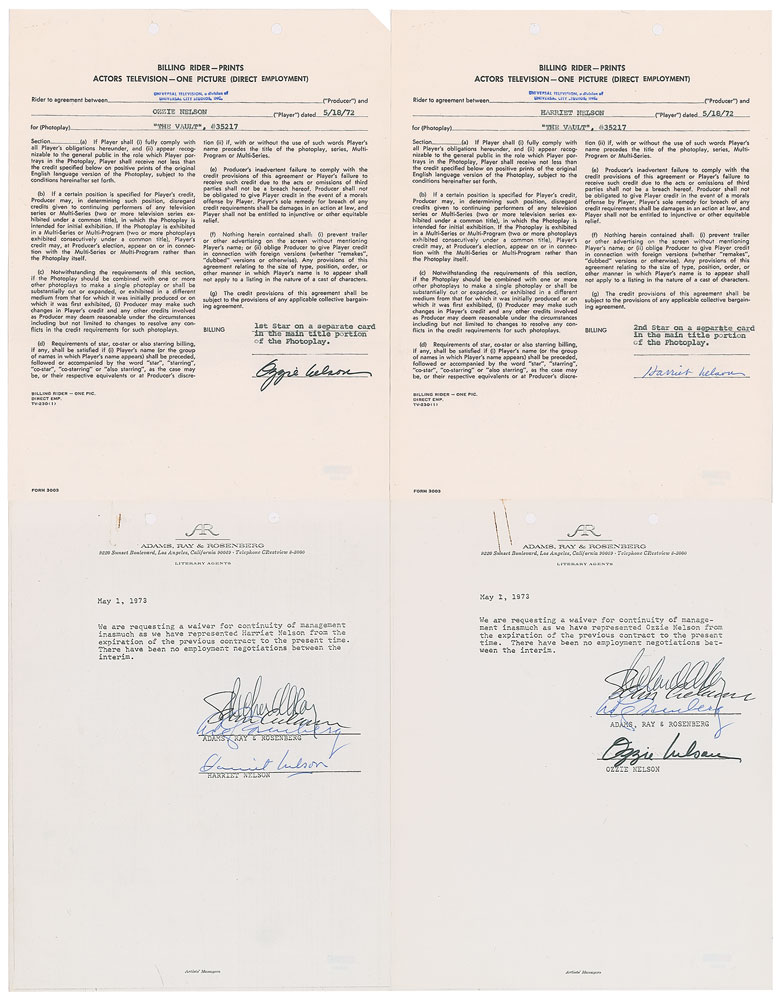 Pair of billing riders between Universal Television and Ozzie and Harriet Nelson, one page each, 8.5 x 11, dated May 18, 1972, with the couple each agreeing to appear in "The Vault," episode 5a of the third season of Rod Serling's Night Gallery. Signed at the conclusion of their respective contract in black felt tip or blue ballpoint. Also included are a pair of official letters from Adams, Ray & Rosenberg, dated May 1, 1973, requesting a "waiver of continuity of management," individually signed at the conclusion by Ozzie and Harriet Nelson. In overall fine condition. The title of episode 5a of the third season of Night Gallery was changed from 'The Vault' to 'You Can Come Up Now, Mrs. Millikan,' with the plot concerning an inventor (Ozzie Nelson) and his wife (Harriet Nelson) who trade in their clumsiness for an experiment in immortality. The episode was based on the short story 'The Secret of the Vault' by J. Wesley Rosenquist. Accompanied by four certificates of authenticity from PSA/DNA.