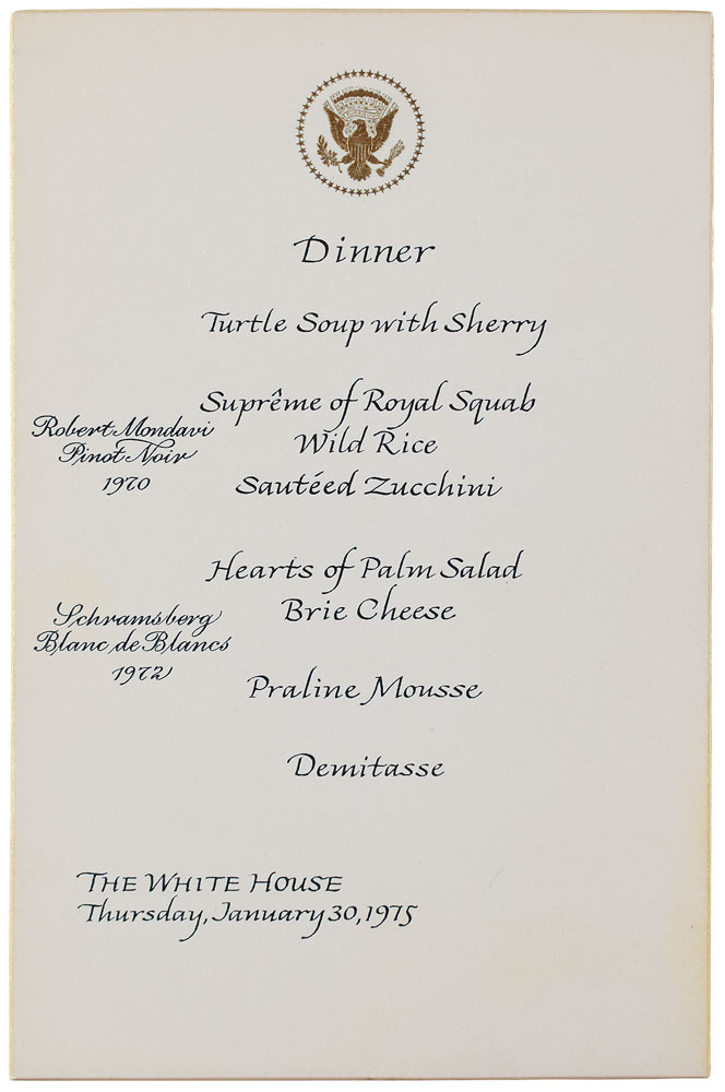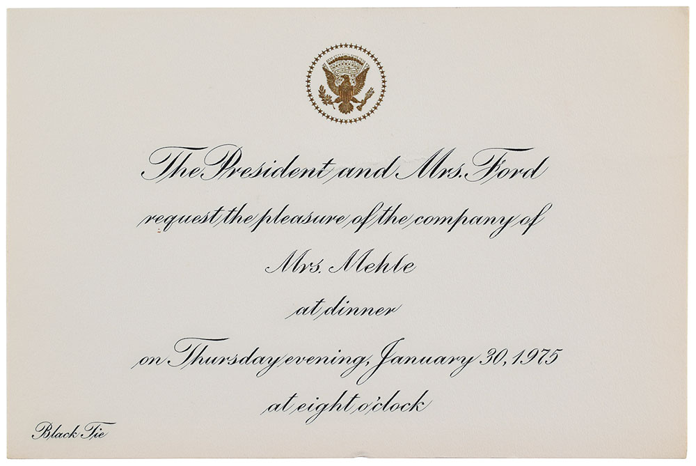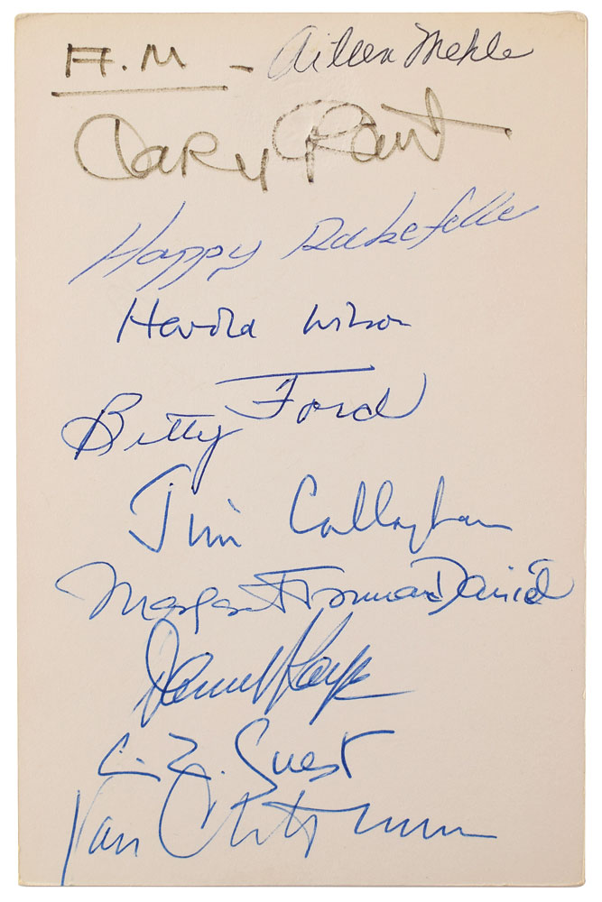 Official dinner menu from the White House state dinner hosted by President Gerald Ford for Prime Minister Harold Wilson of Great Britain on January 30, 1975, one page, 4 x 6.5, signed on the reverse in various inks by several noteworthy attendees, including: Cary Grant, Happy Rockefeller, Harold Wilson, Betty Ford, Jim Callaghan, Margaret Truman Daniel, Danny Kaye, C. Z. Guest, and Van Cliburn. In fine condition. Accompanied by the original invitation for the dinner to society columnist Aileen Mehle.