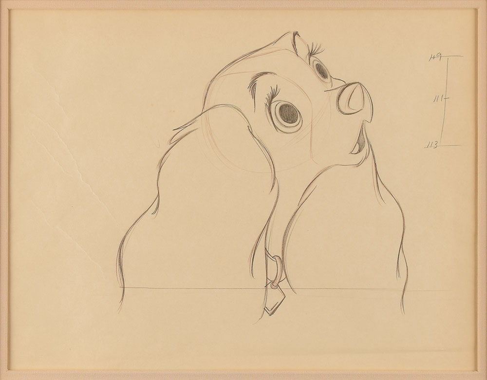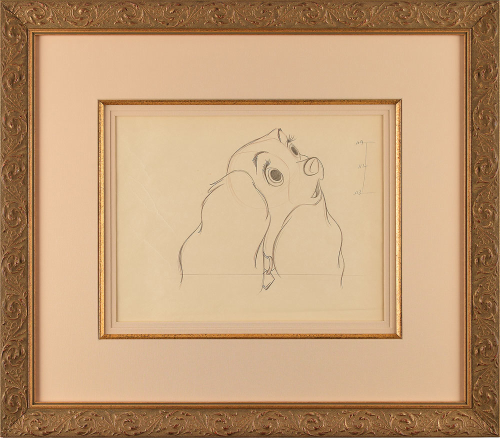 (Walt Disney Studios, 1955) Large original production drawing of Lady from Lady and the Tramp, featuring a close-up portrait of the doe-eyed title character. Accomplished in graphite on animation paper. Image measures 8 x 7.5, with a mat opening of 12.75 x 9.75. Ornately framed to an overall size of 23.75 x 20.75. In fine condition.
