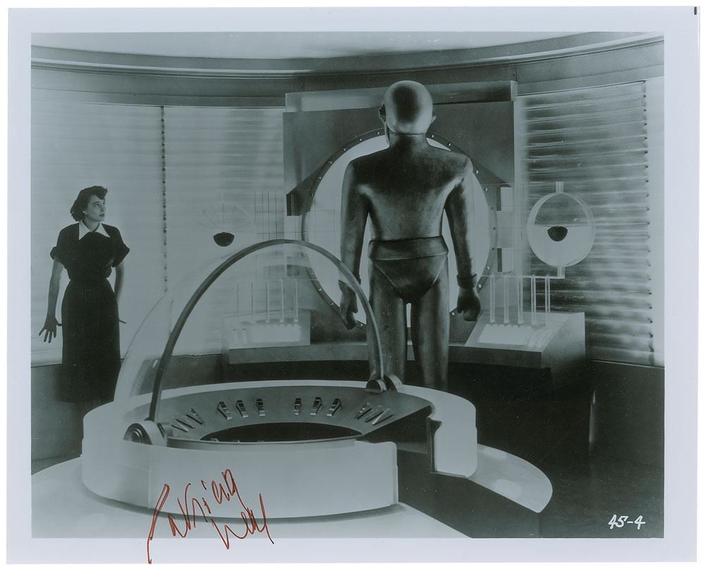 Glossy 10 x 8 photo of Patricia Neal as Helen Benson standing next to the robot Gort in the 1951 sci-fi classic The Day the Earth Stood Still, signed in red felt tip. In fine condition.